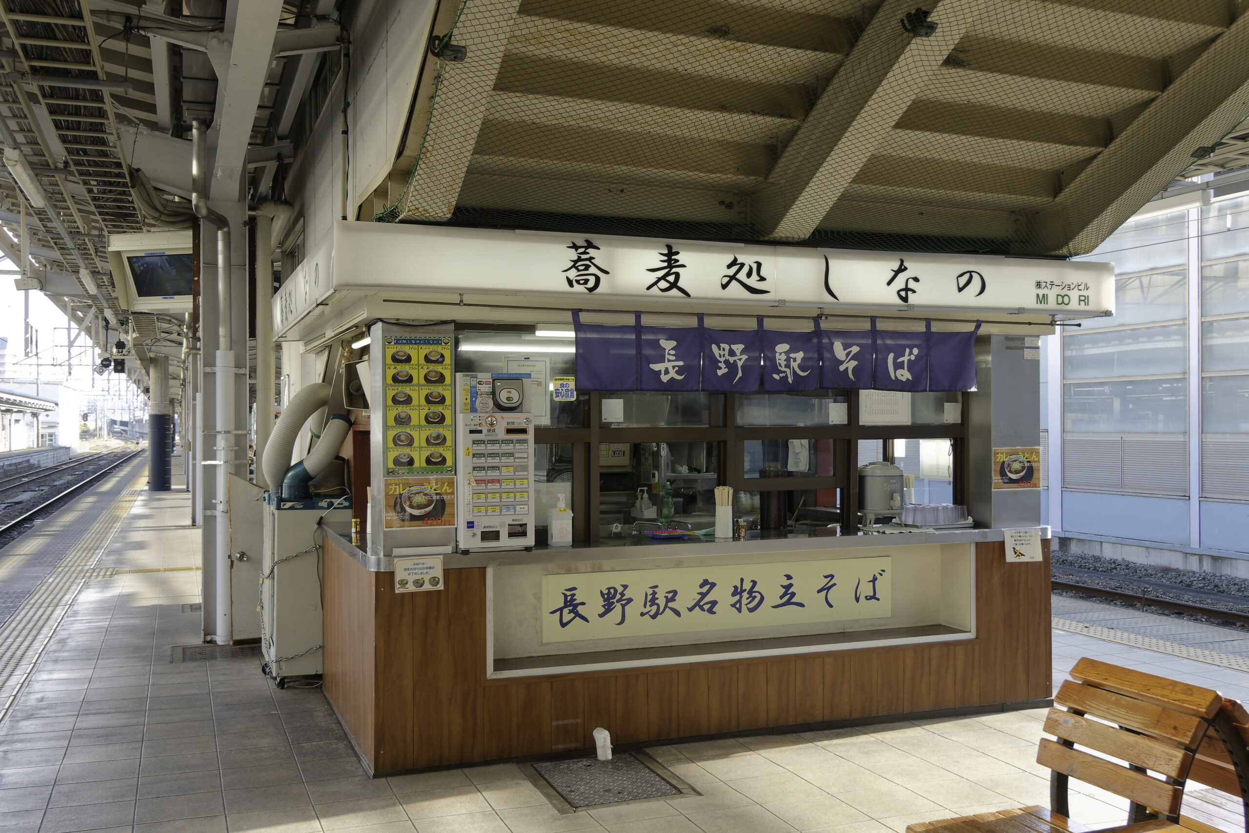 長野駅で下車。ホームに漂うそばつゆの香りに誘われて、思わず駅そばへ。旅情をかき立てられる。