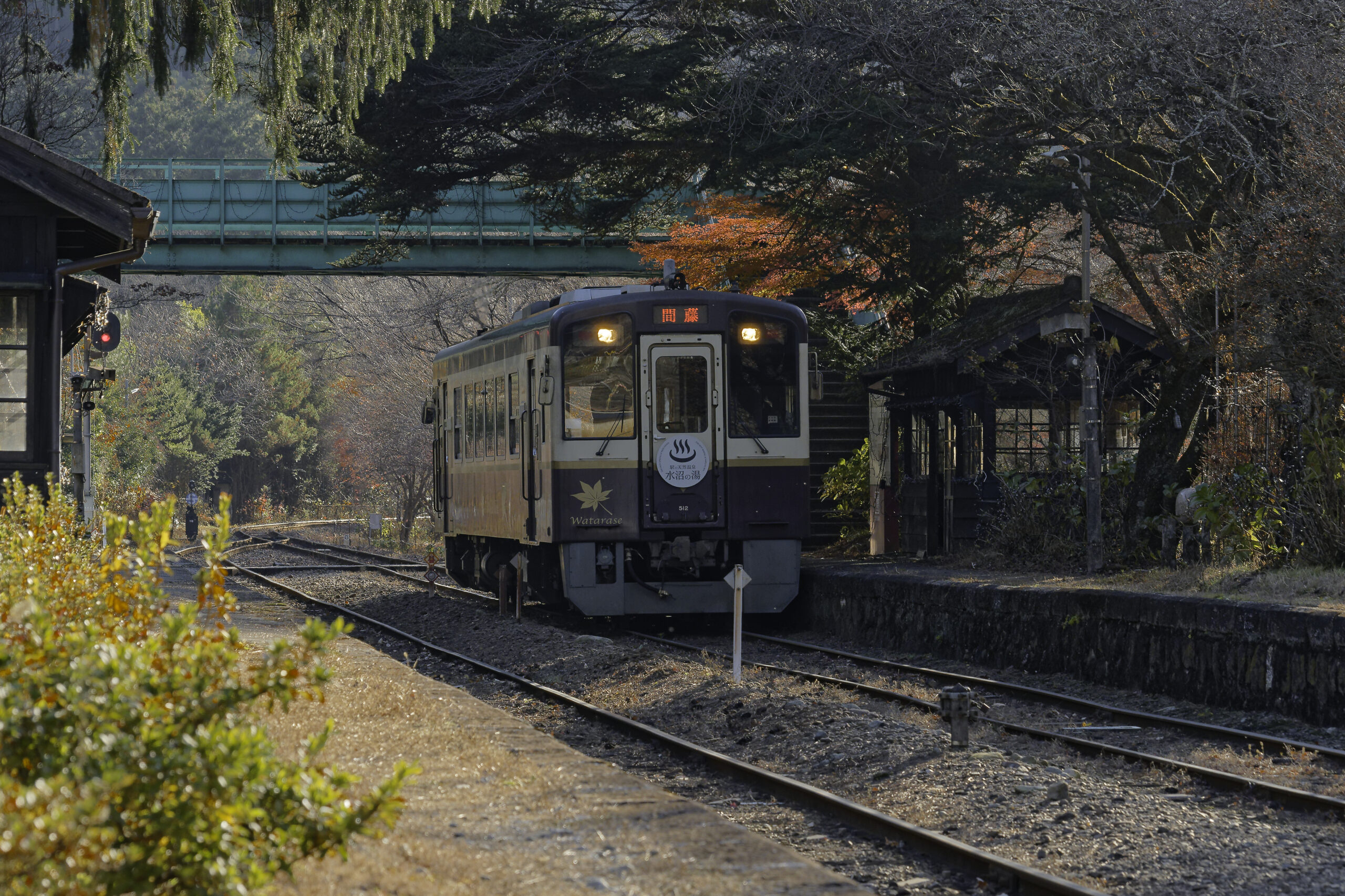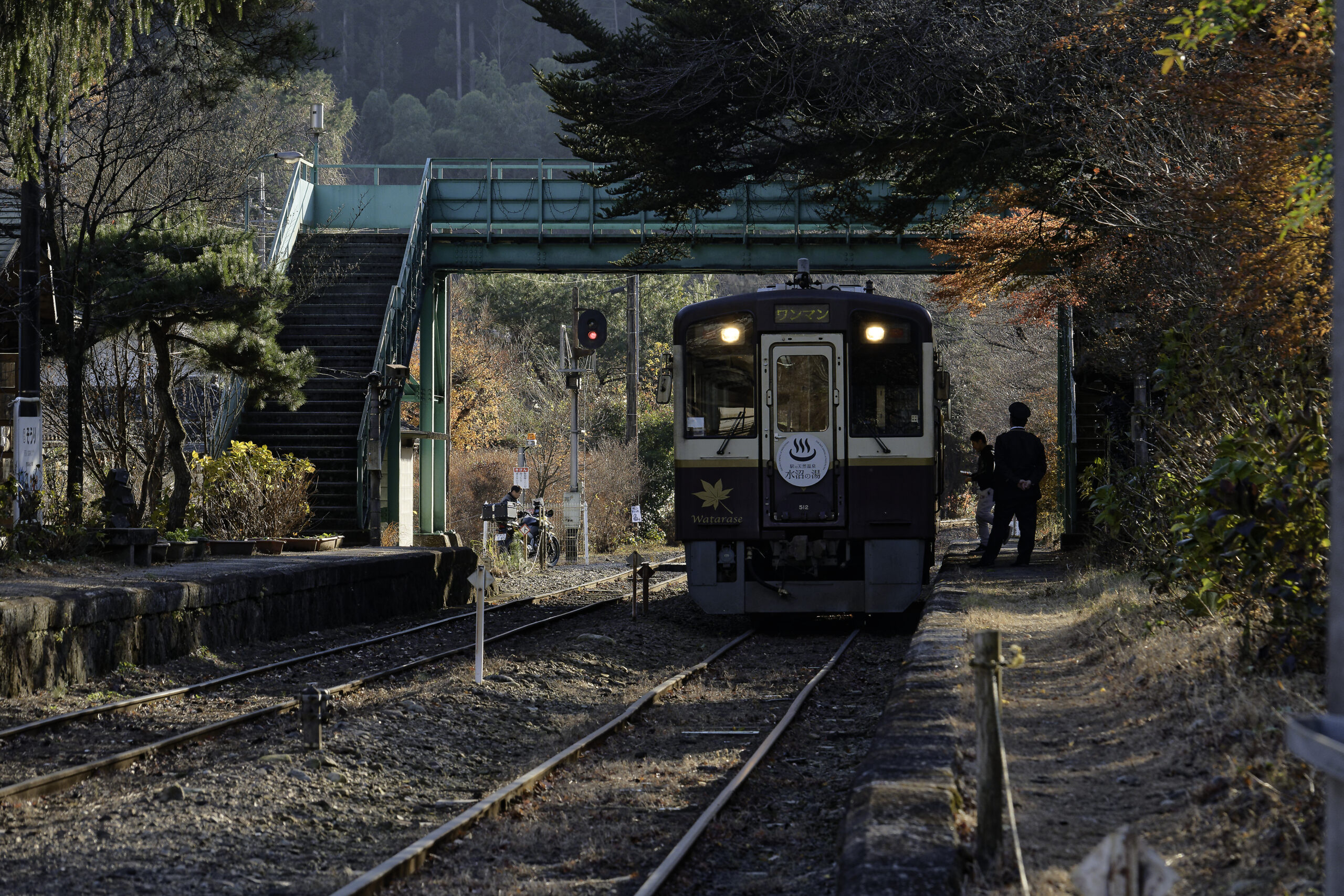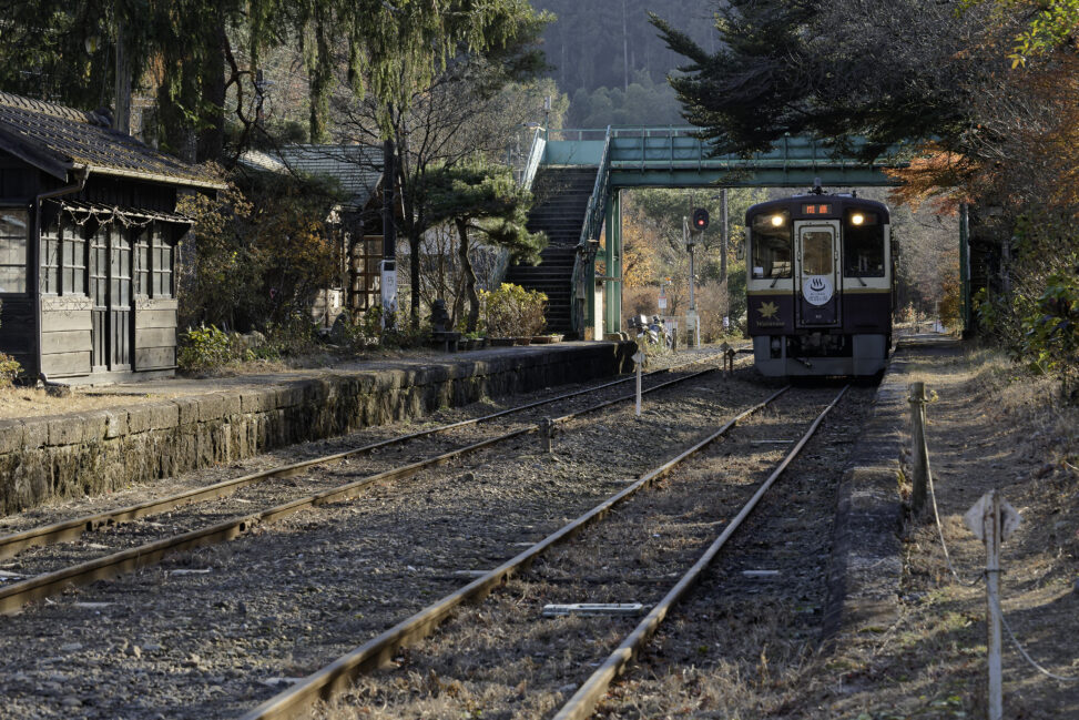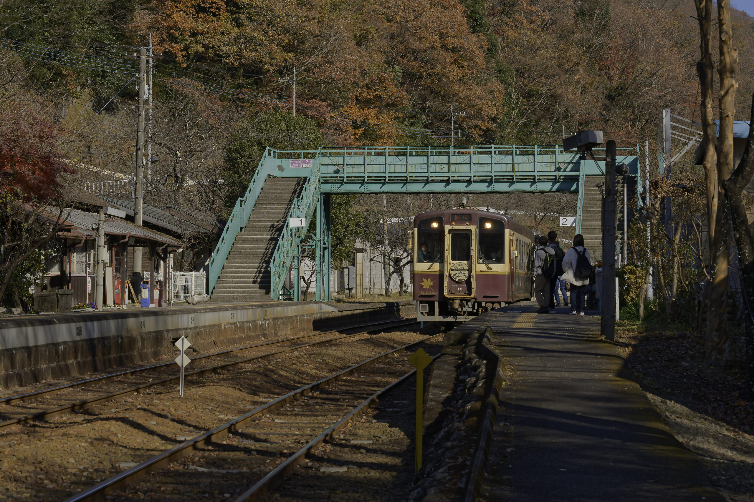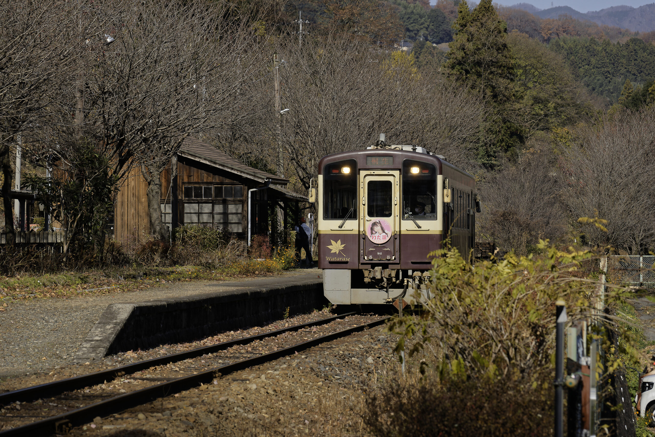大間々駅では出発する下り列車を踏切で車中から見送ることになったが、上神梅(かみかんばい)駅、神戸(ごうど)駅、沢入(そうり)の3駅で、列車、それも単行だが、捉えることができた。すでに盛りを過ぎたとはいえ紅い紅葉が秋の陽に映える。