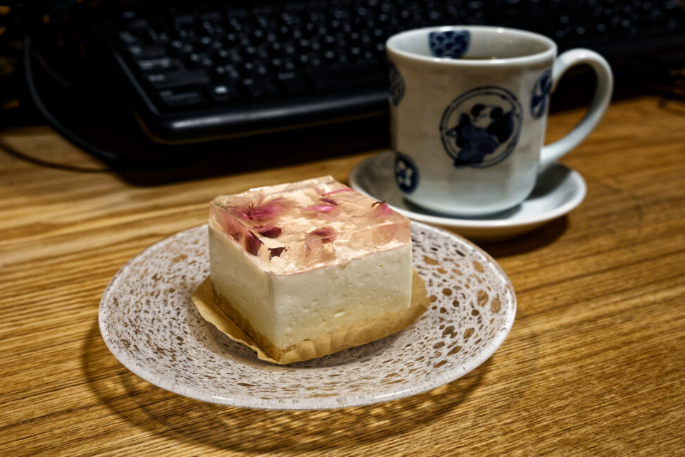被写体は、桜の塩漬けが透き通るチーズケーキ。