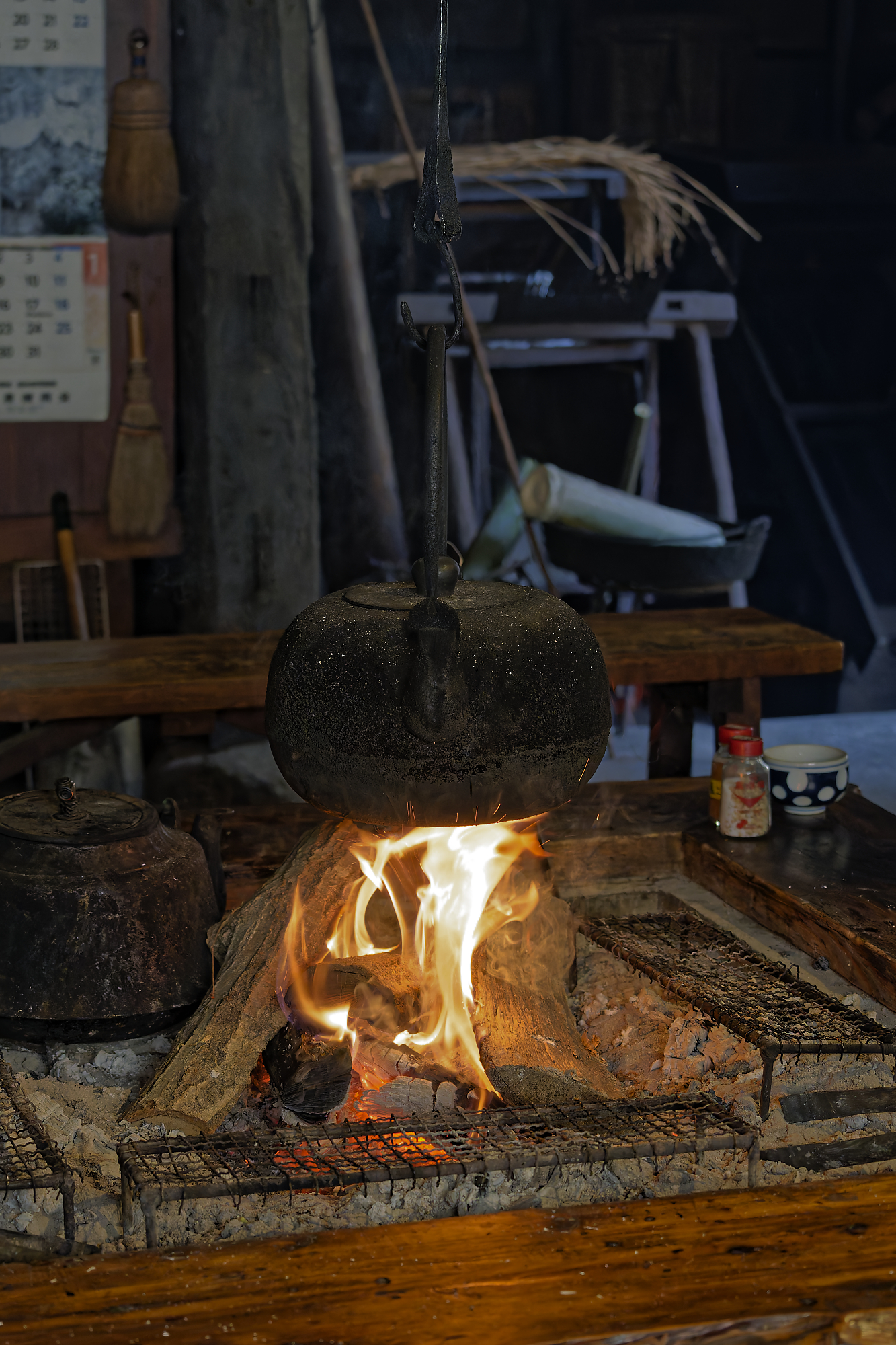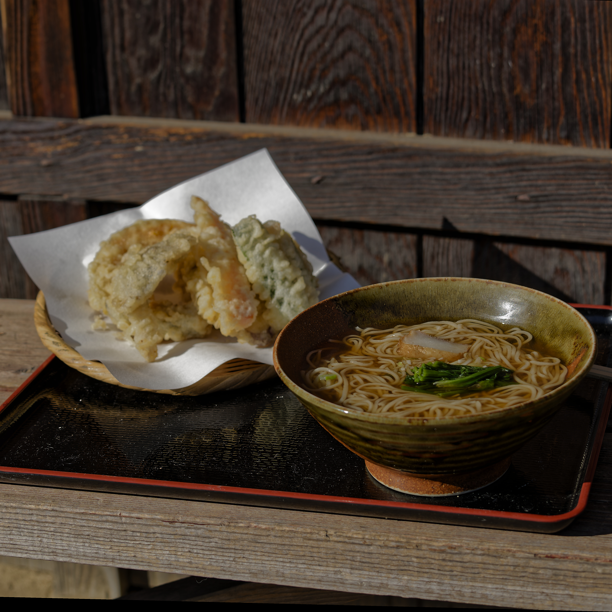 昼食を物色するのも楽しい。今日は吉田家住宅で蕎麦。囲炉裏の煙に包まれながらしばらく待つが少し冷えてきたので軒下の縁台で待つ。陽だまりでのんびり。飛行機の航路にあたるのか、大型機が何機か通過する。