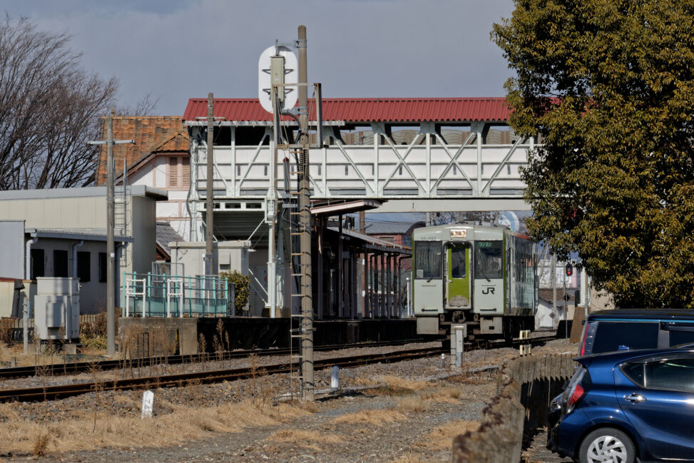 引退間近の気動車が出発。かつてはSL牽引の列車の発着した駅。やはり跨線橋があるというのは駅の華やかだったころを忍ばせる遺構といえる。