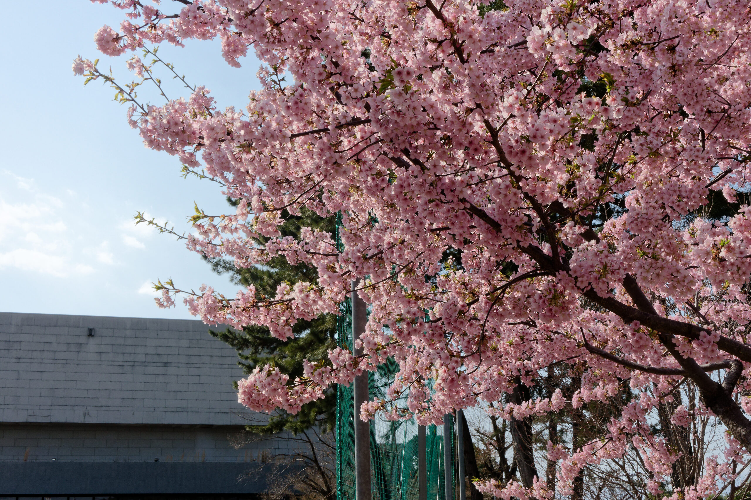 今解体かどうかで話題の県民会館の隣では早咲きの桜が満開。強風にもまだ散り始めてはいない。