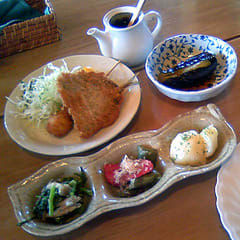 ランチセットをいただくことにした。玉葱たっぷりのコンソメスープ、野菜サラダ、惣菜4種、フライ、ごはん、漬物、クッキー、コーヒーと盛り沢山。パクパクと平らげる。どれもおいしい。ただしダイエットにはならず。・・・せっかくカロリーを消費したのに。