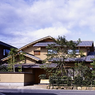 この建物の特長は、流れの多い屋根にあると思われます。形状の主は日本瓦葦切妻造りでありますが、起りを付けた事により、全体に柔軟な外観に仕上がっていると思います。