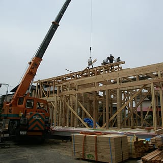 施工者の作業場で加工され準備された木材がいよいよ現場で基礎の上に立ち上がる。