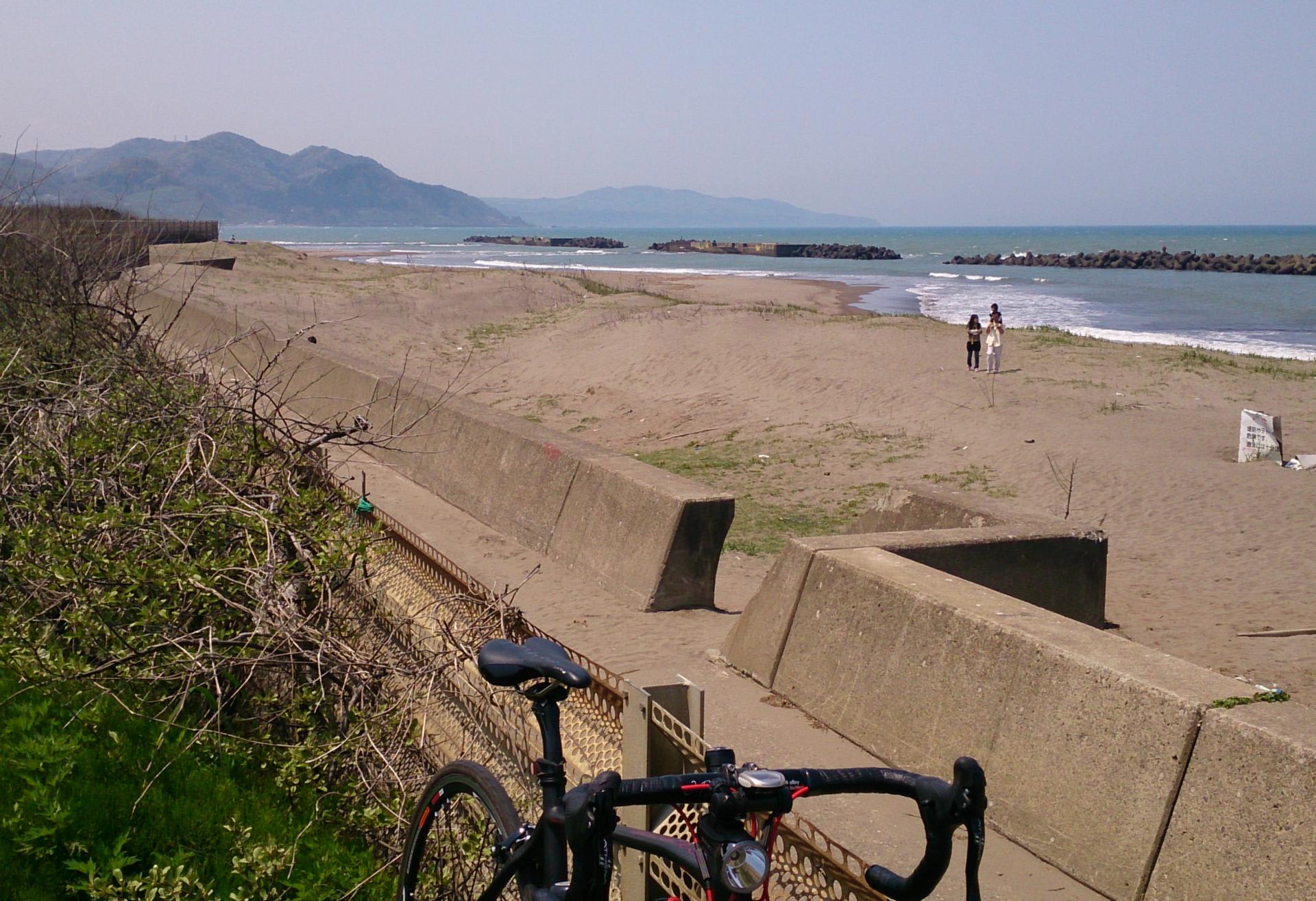 北陸線の陸橋を越えるとすぐ海岸。やっと到着。11時15分