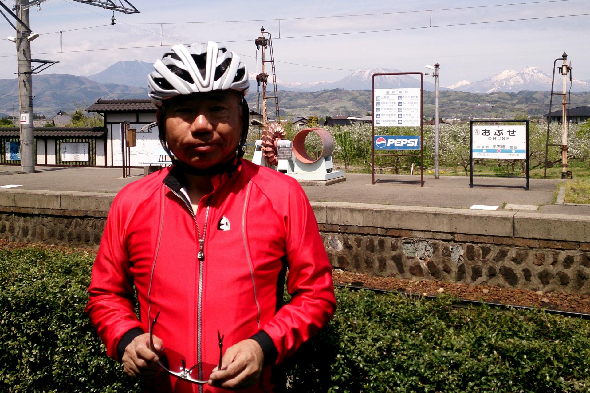 中野市経由で小布施駅で休憩、若いカップルの撮影したお返しにこちらも写真をとってもらう。