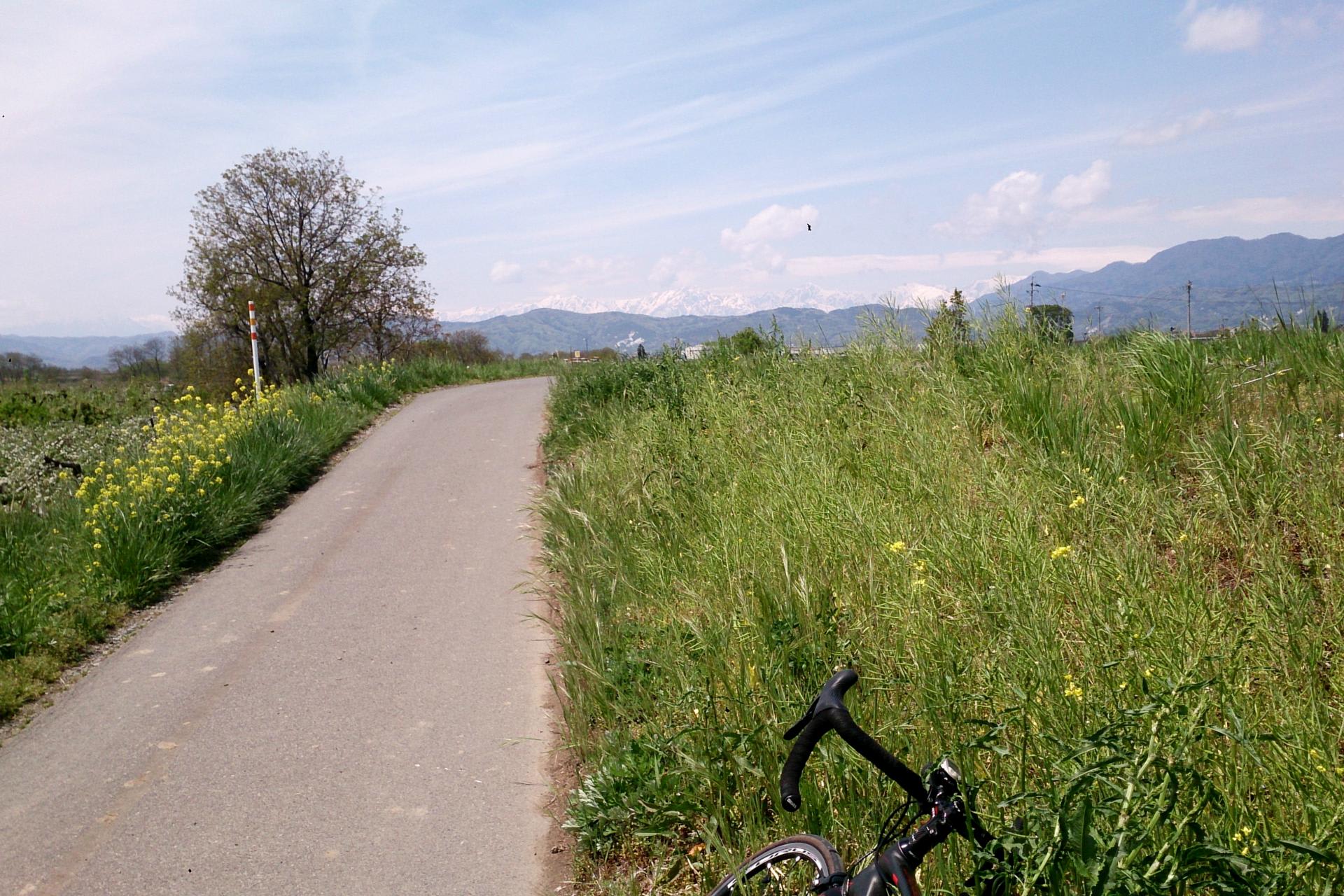 千曲川沿いの名残の桜並木沿いの土手上を落合橋まで走り、川中島の古戦場跡を通過。