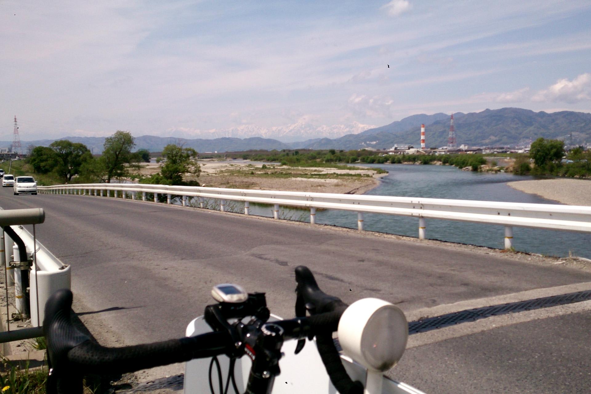 ゆったりと、かつ雪解け水を豊富に集めて流れる千曲川とその川岸の新緑、また周囲の残雪をたっぷり残した遠方の山々に心がほぐれていく。