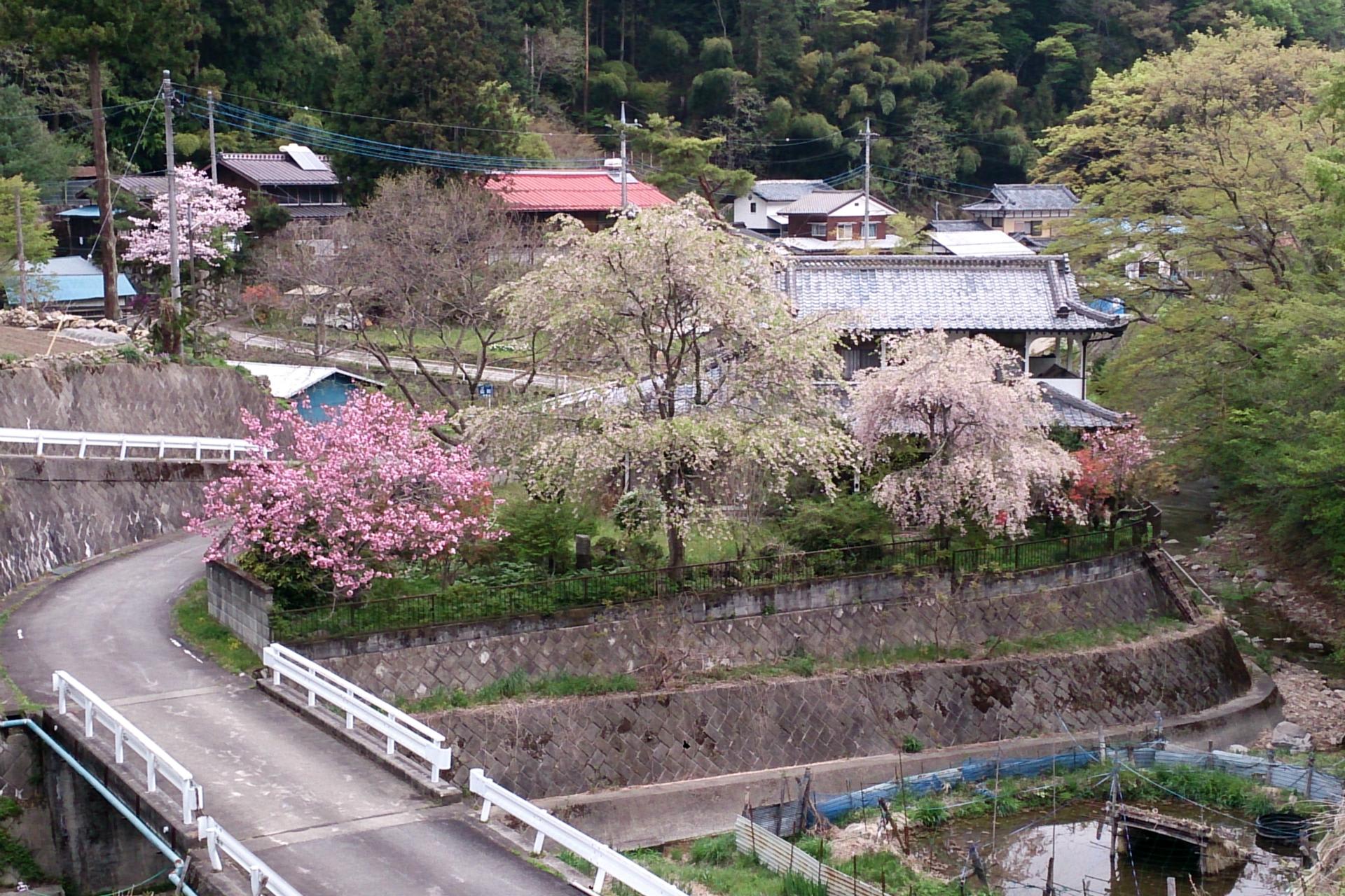 小鳥のさえずりと川の瀬音しか聞こえない静かなひととき、スギの香りに包まれる。山里の桜ももう終わり。