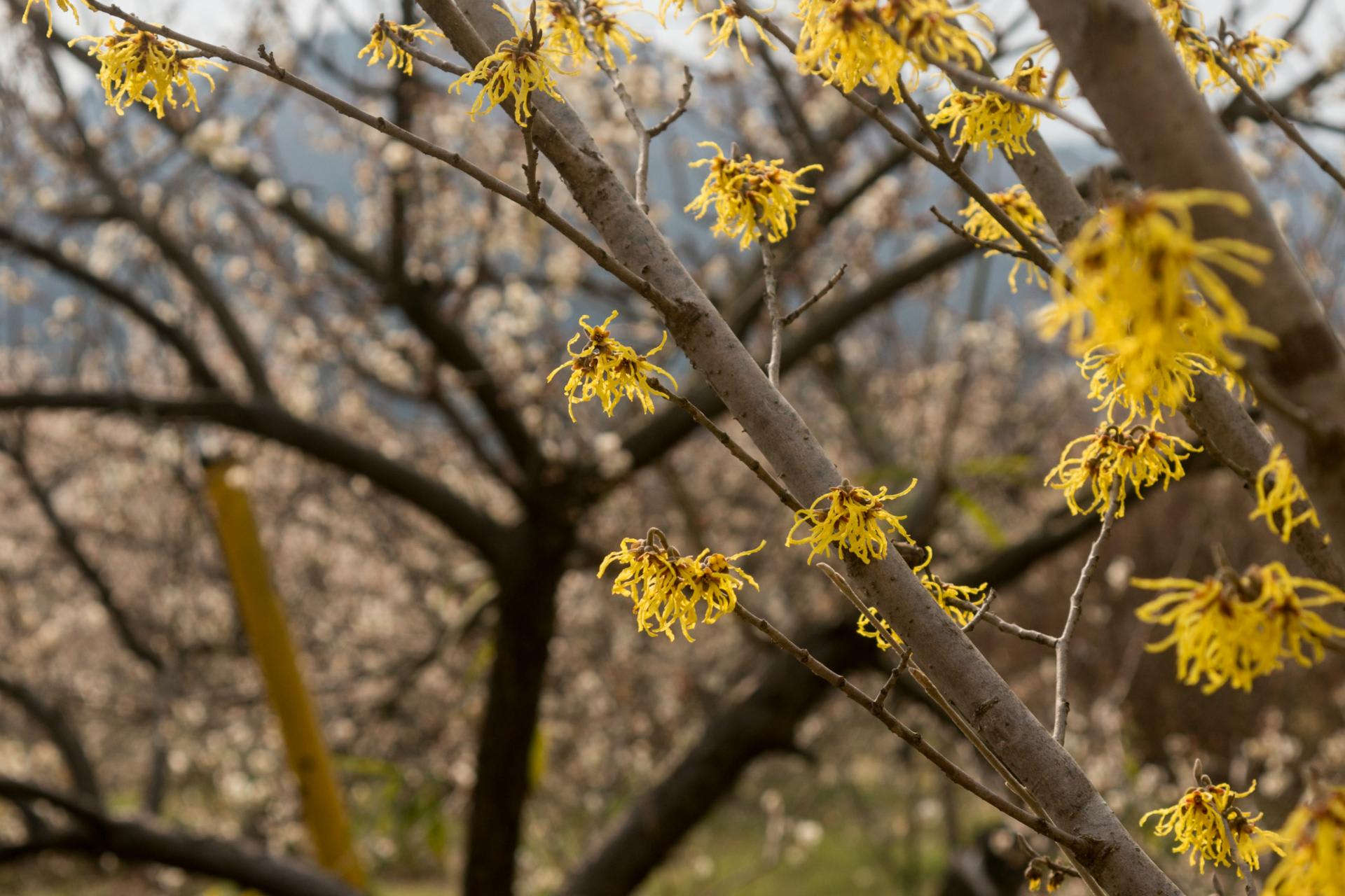 マンサク、サンシュユ、さらにオオイヌノフグリ等、春の野を彩る花が咲いている。