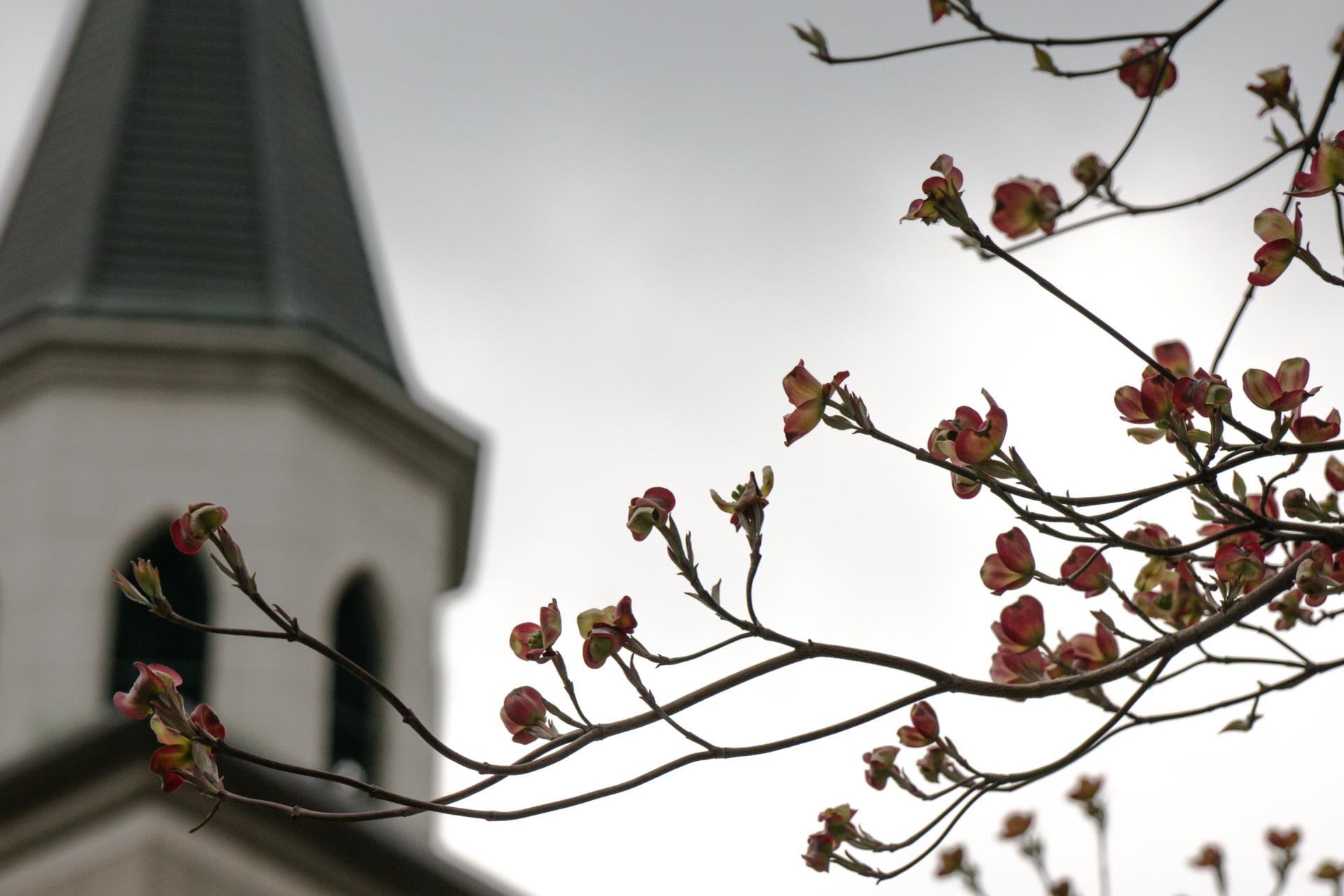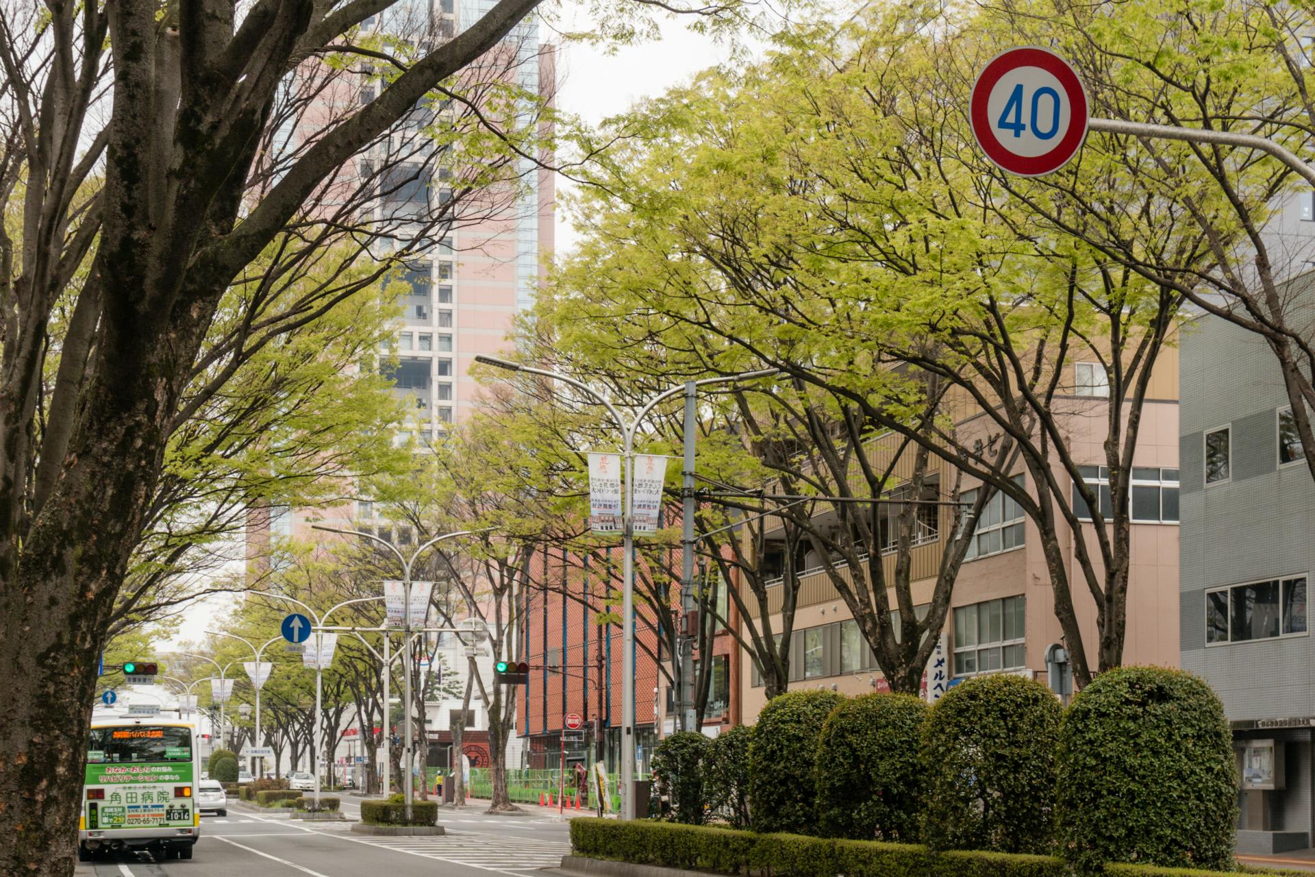 さくらの花びらが歩道を淡紅色に染めて枝には若葉がめだつようになった。一方アメリカハナミズキが咲き始め、県庁前のけやき並木はさわやかな若葉色。春の主役が交代していく。