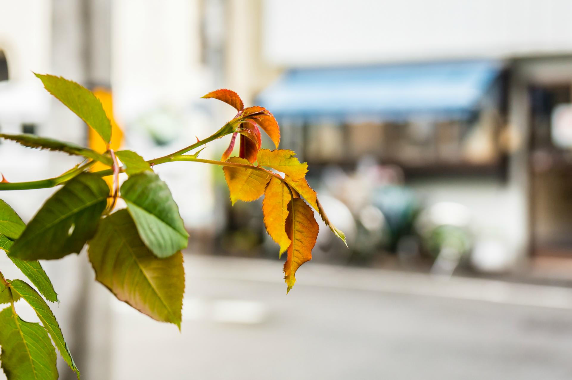 薔薇の葉が赤から緑までのグラデーションが美しい。