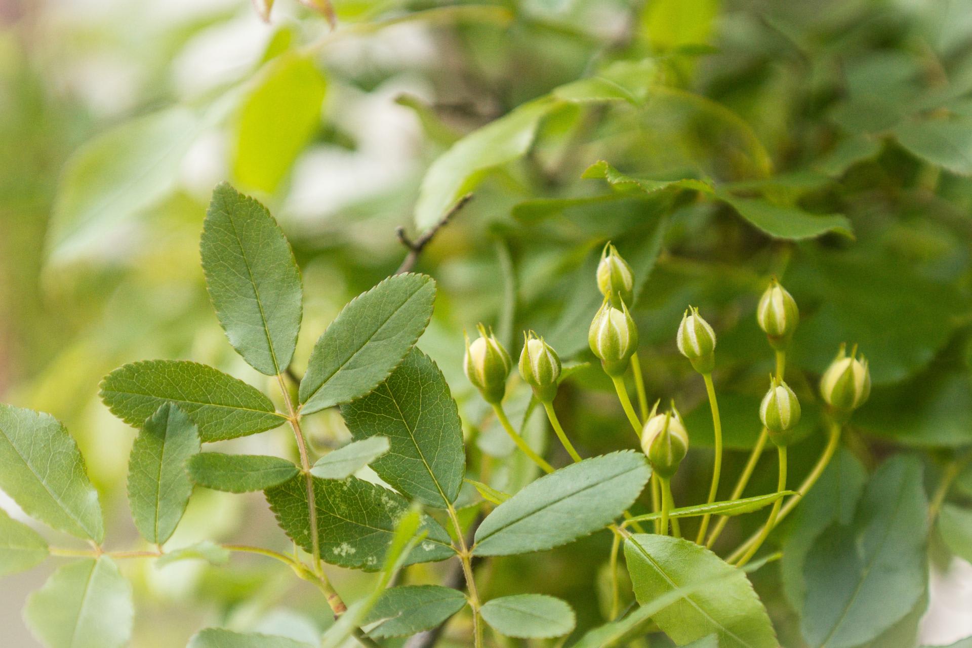 木香薔薇がもうじき咲きそう。蕾が大きく膨らむ。