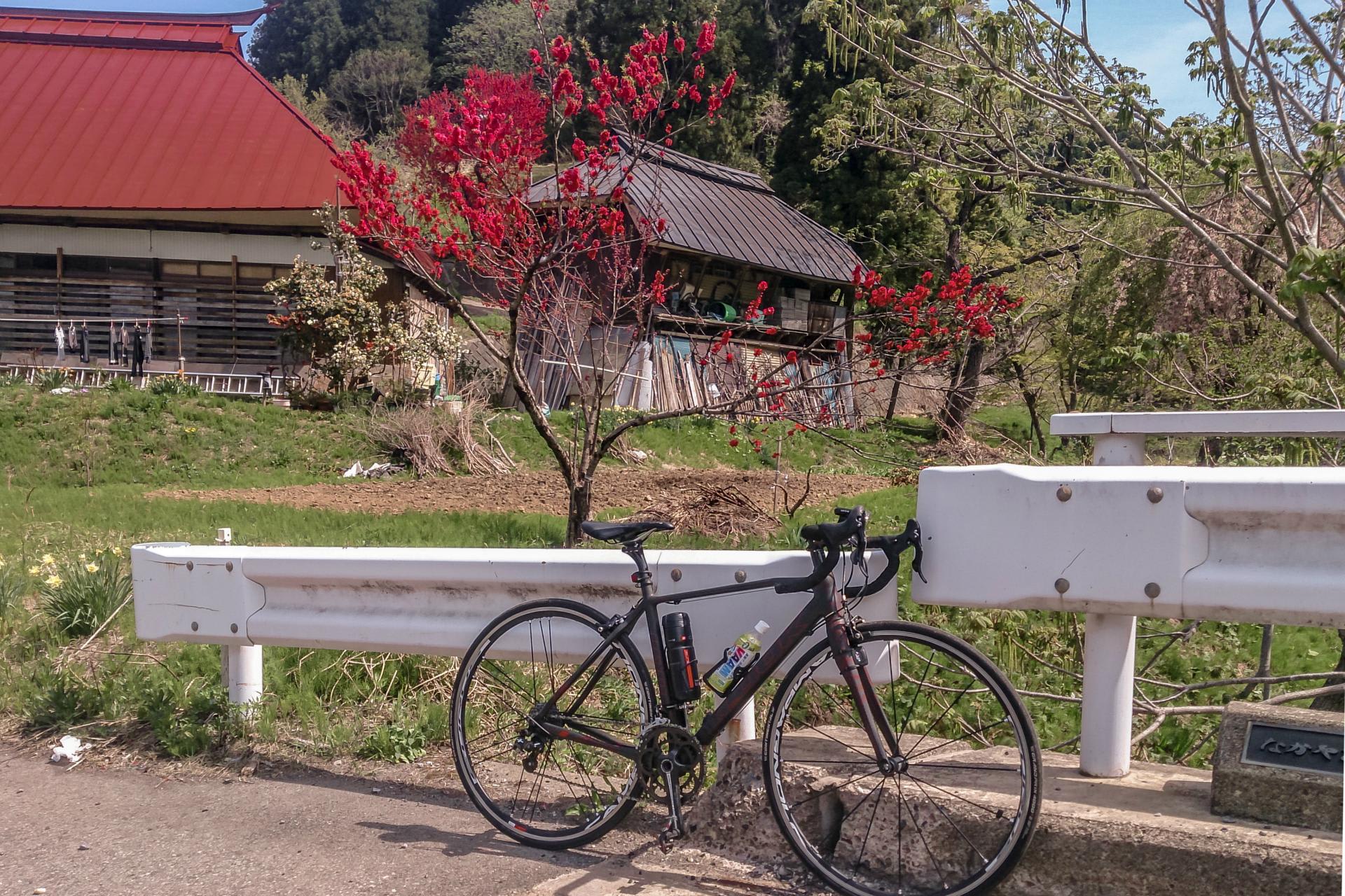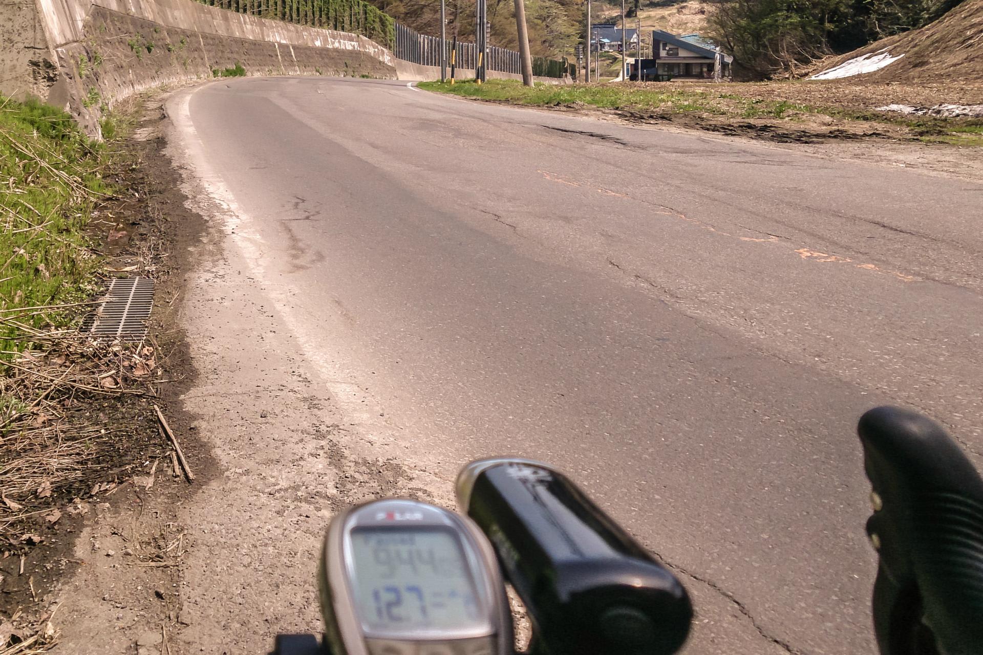 ただし、飯山側を6kmも登れば海まで下り。残雪が残る峠道。雪しろで水かさを増した渓流沿いに下る。路面が荒れているのでハンドルに振動がくるのはやむをえないところ。