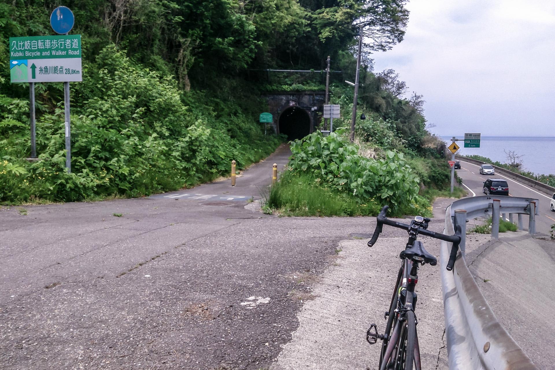 糸魚川までは自転車専用線を走る。北陸本線の旧線路敷きを整備されたという道で鉄錆の汚れも残る擁壁沿いに走ると列車の機関士になったような気分あり。