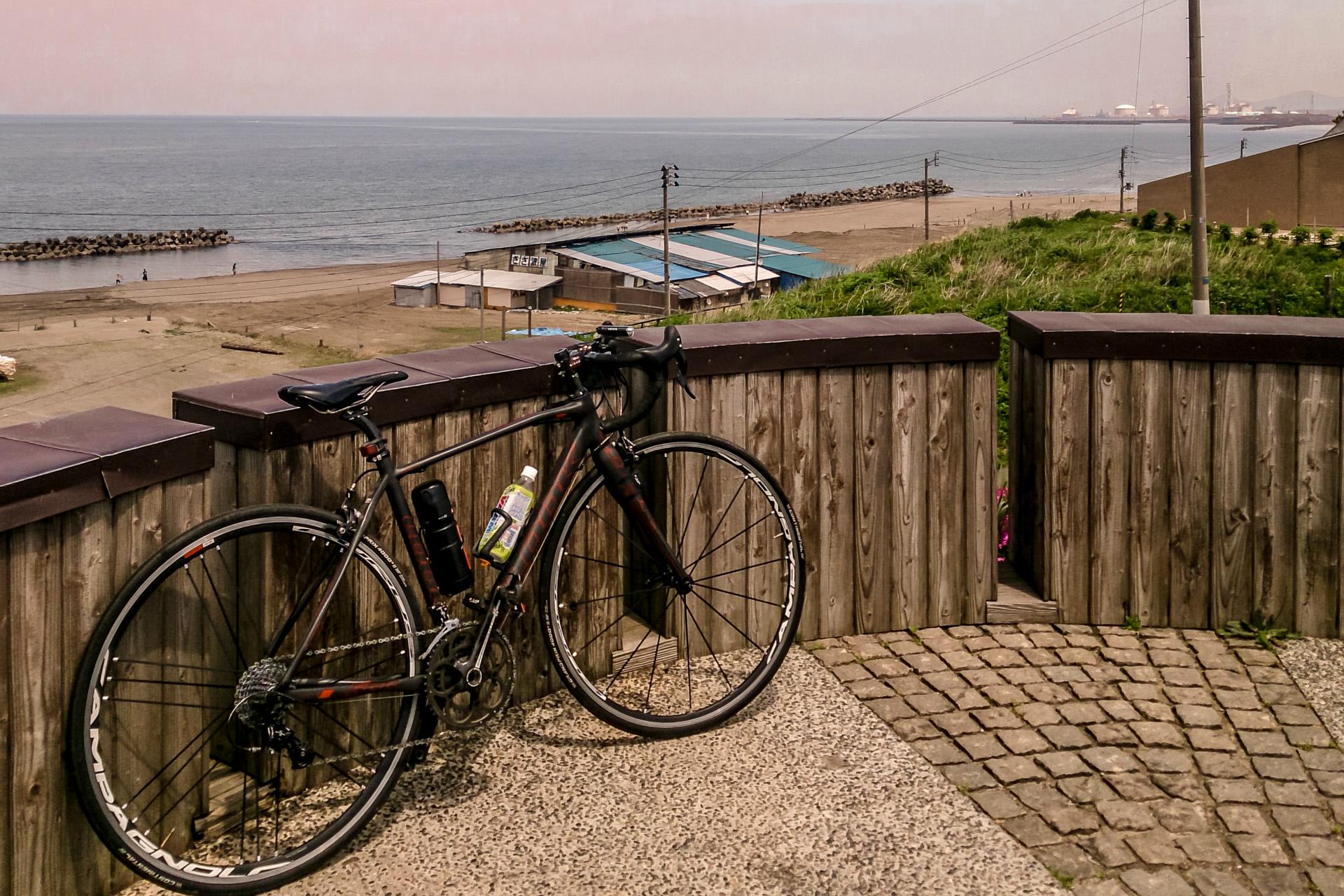 50kmほど走ると直江津の海。親鸞上人上陸の地とされる浜でひと休み。