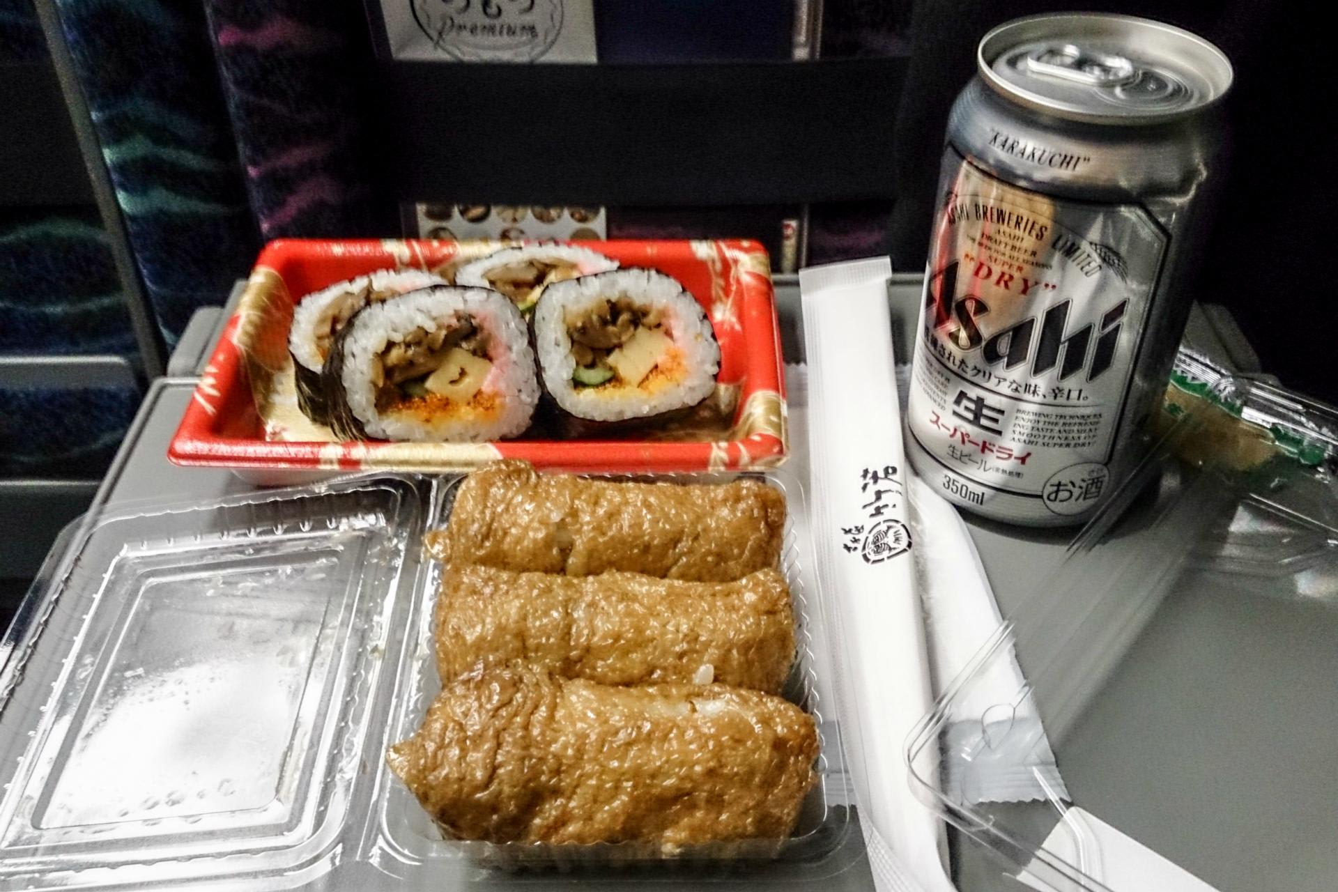 閉店間際の東京駅の売店で夕食を買い、新幹線の中で一息つく。