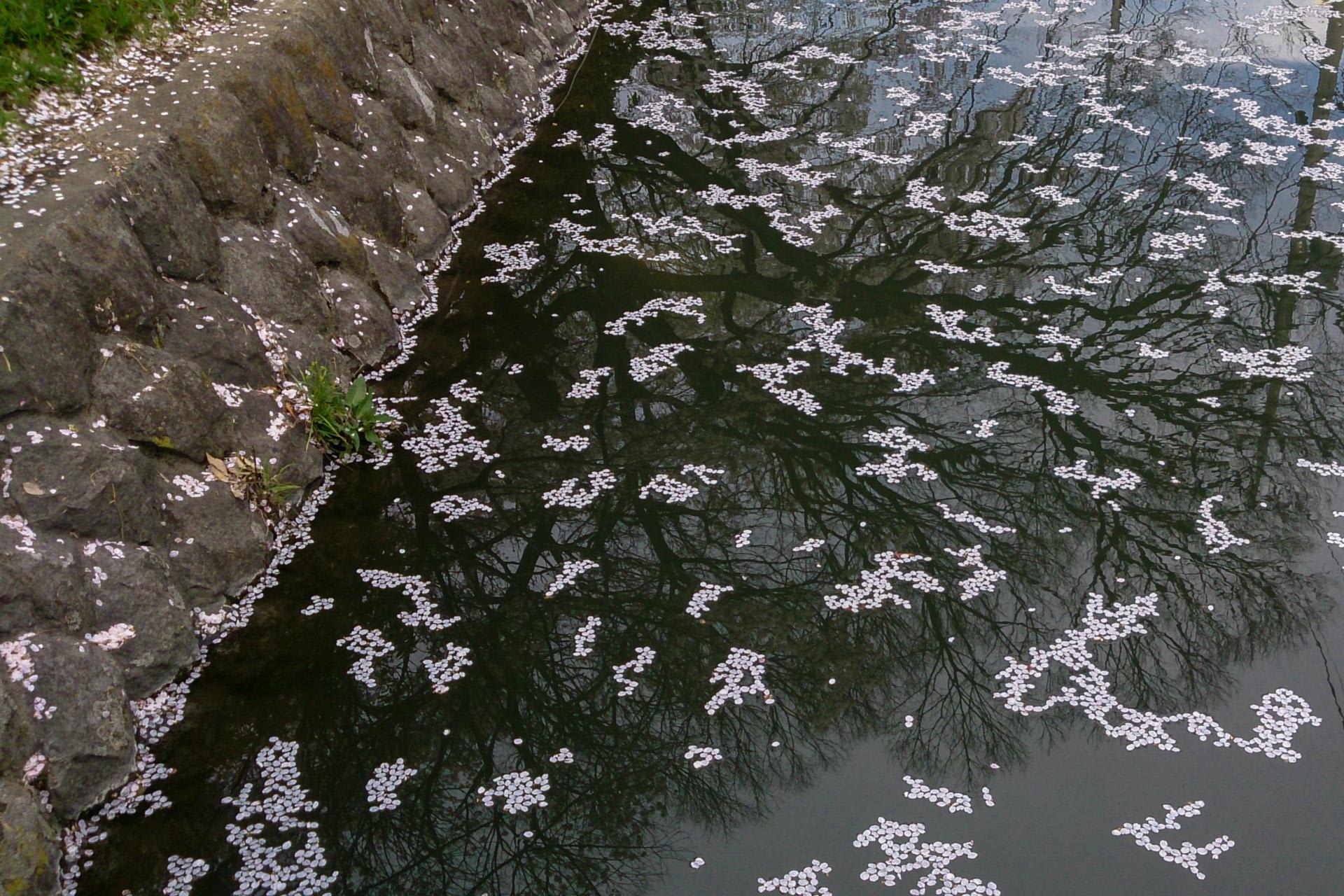 今日は高崎市役所に用事があり出向く。ふとお堀に目をやると花びらが水面をただよっている。