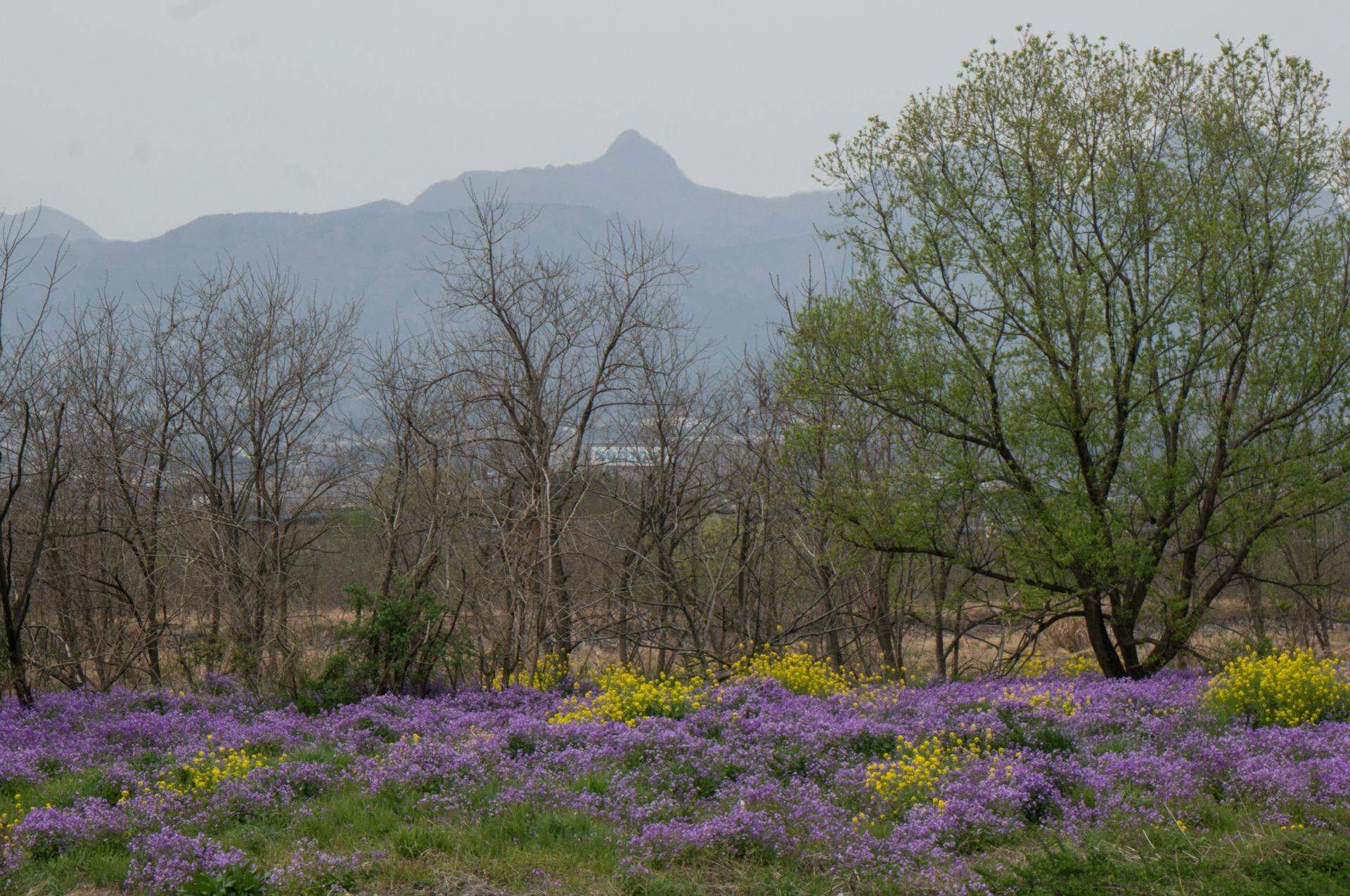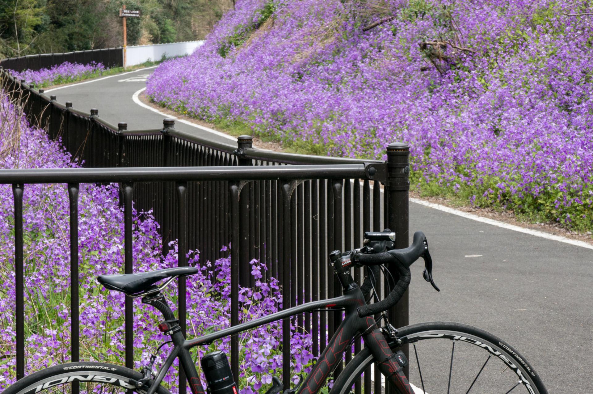 今、河原は菜の花と諸葛菜が見ごろだ。柔らかな色彩でサイクリングロードが包まれる。