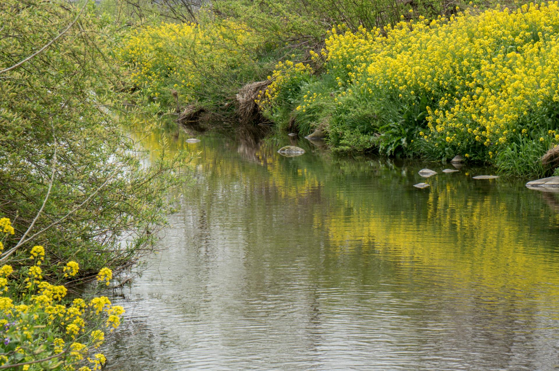 広い河原も菜の花の黄色い群落に覆われている。明るい。