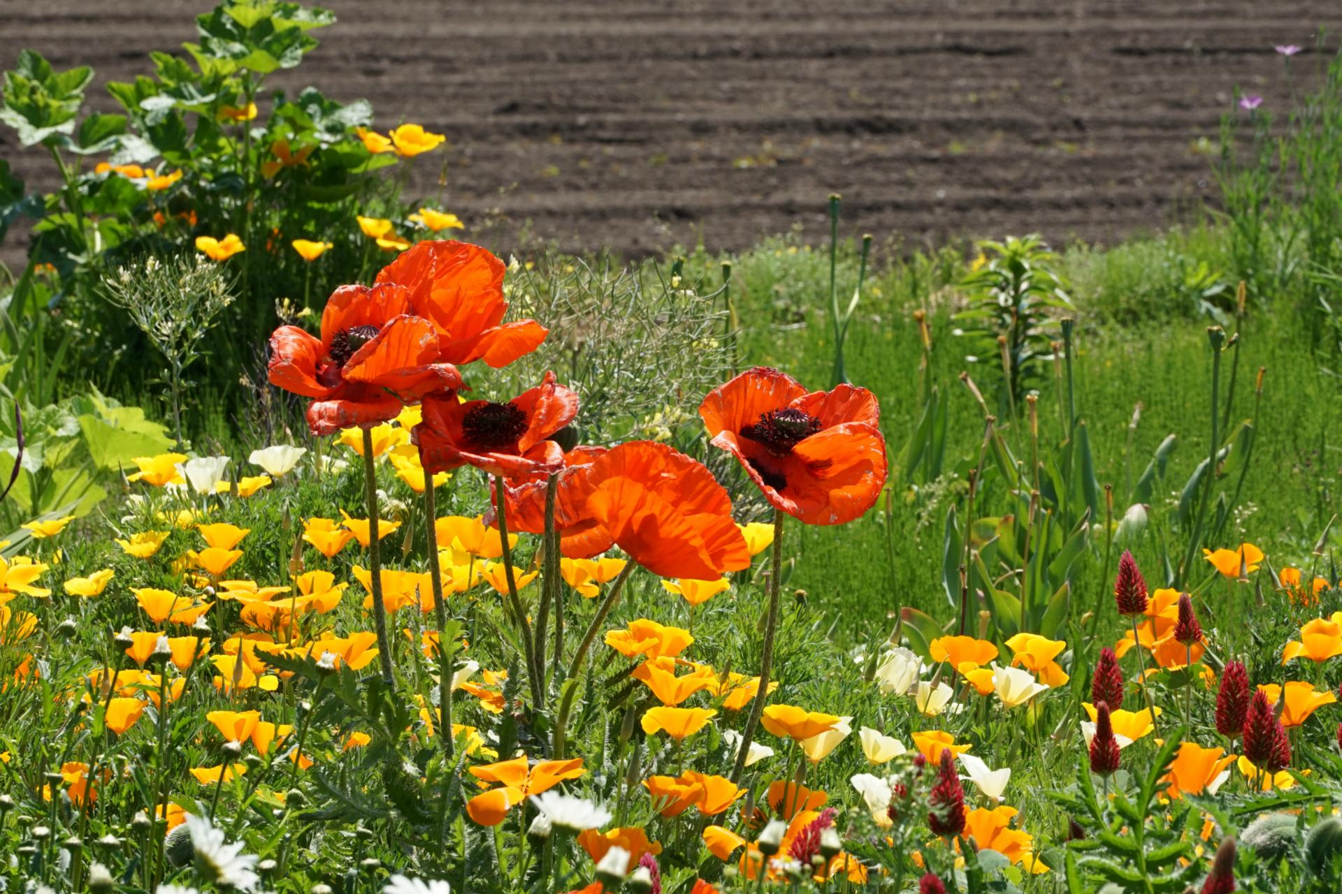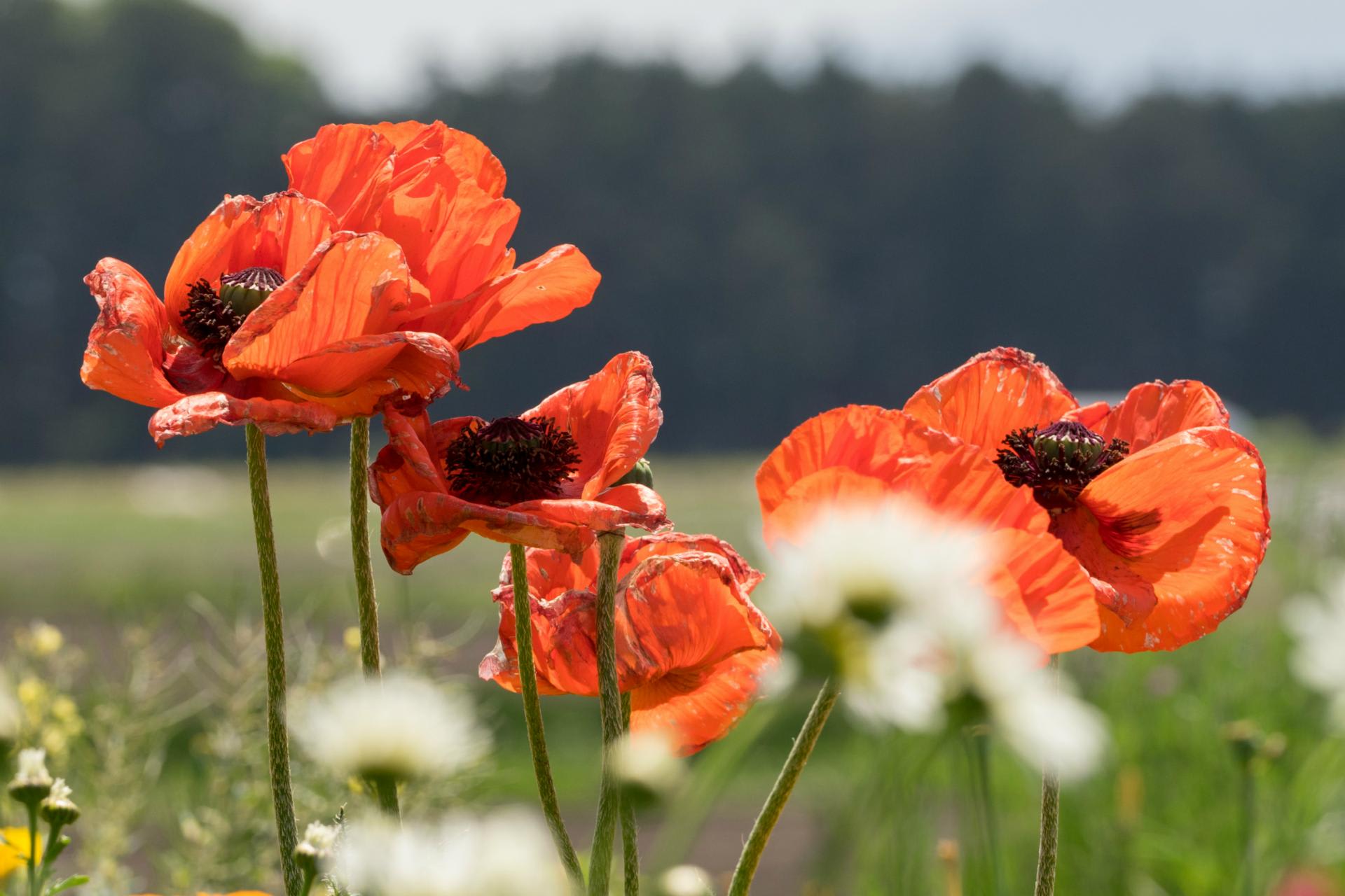 大きなポピーがおりからの強い風にゆられ陽光を透過した花弁が鮮やか。陽射しはもう夏。