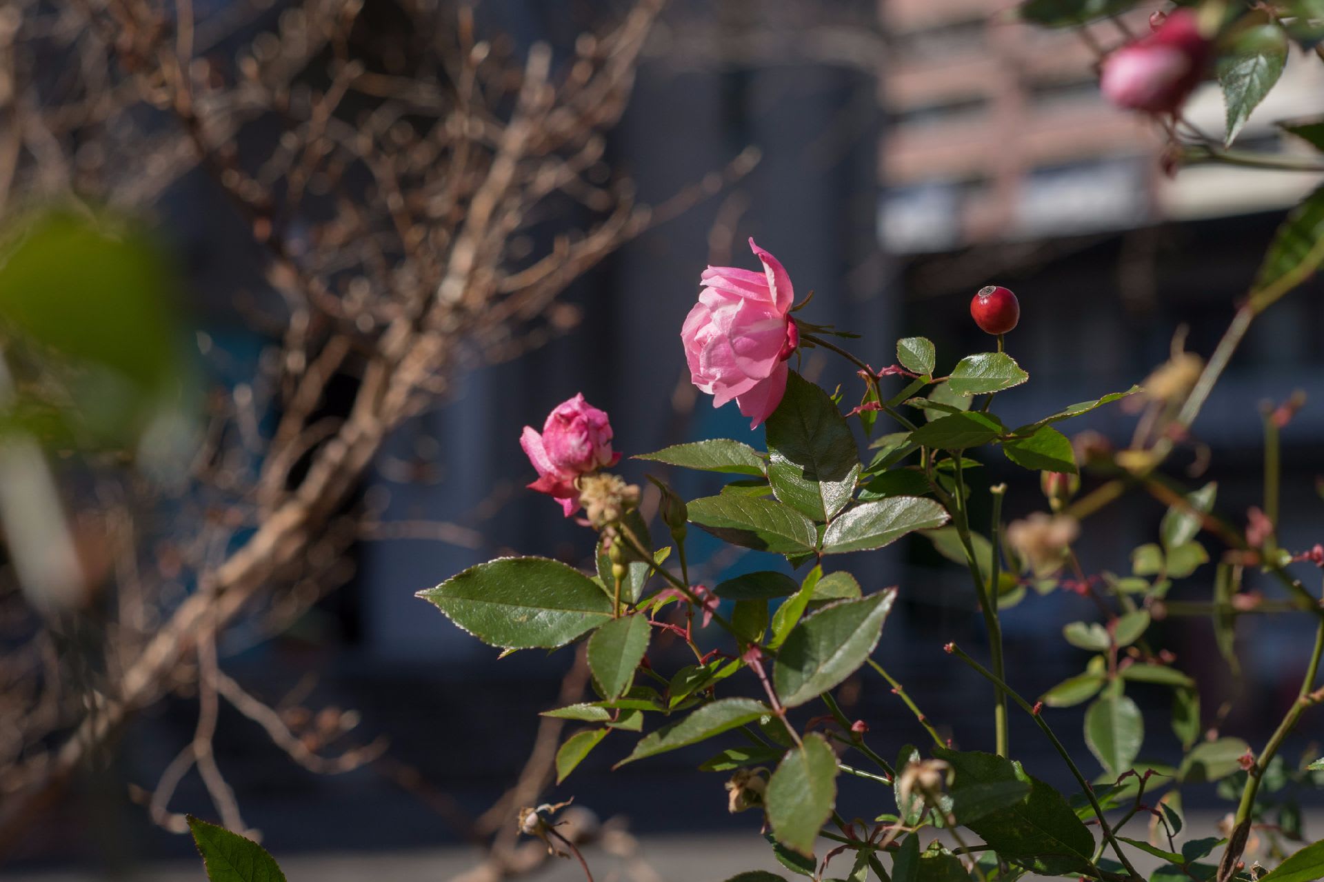 公園の紅梅や街角の蝋梅、まだ蕾の白木蓮、冬咲きの薔薇、等お気に入りを一通り回る。