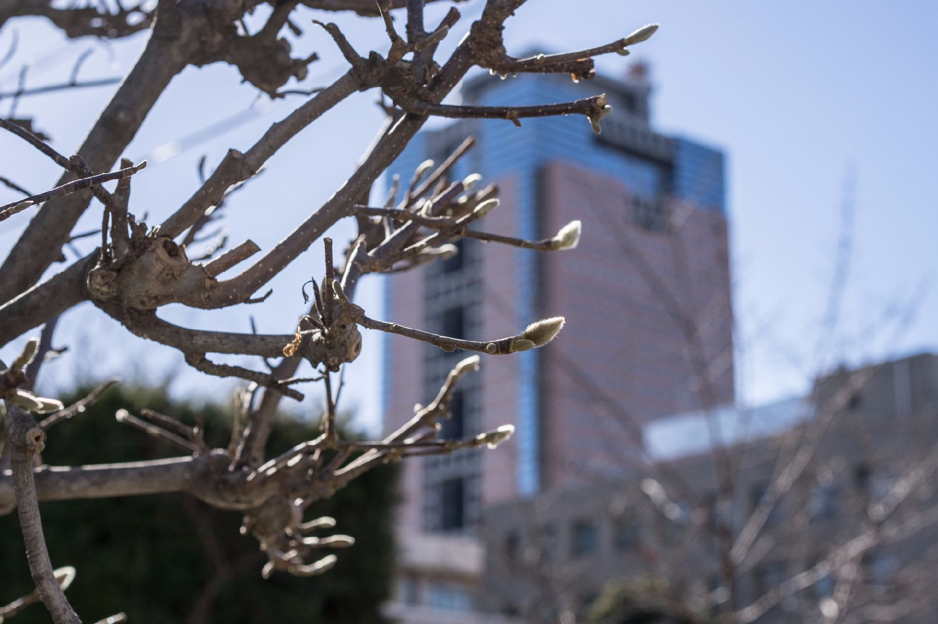 教会の山茱萸はまだまだ固い蕾のまま。花の種類は少ないが緑さえ少ないこの時期、一層艶やかだ。
