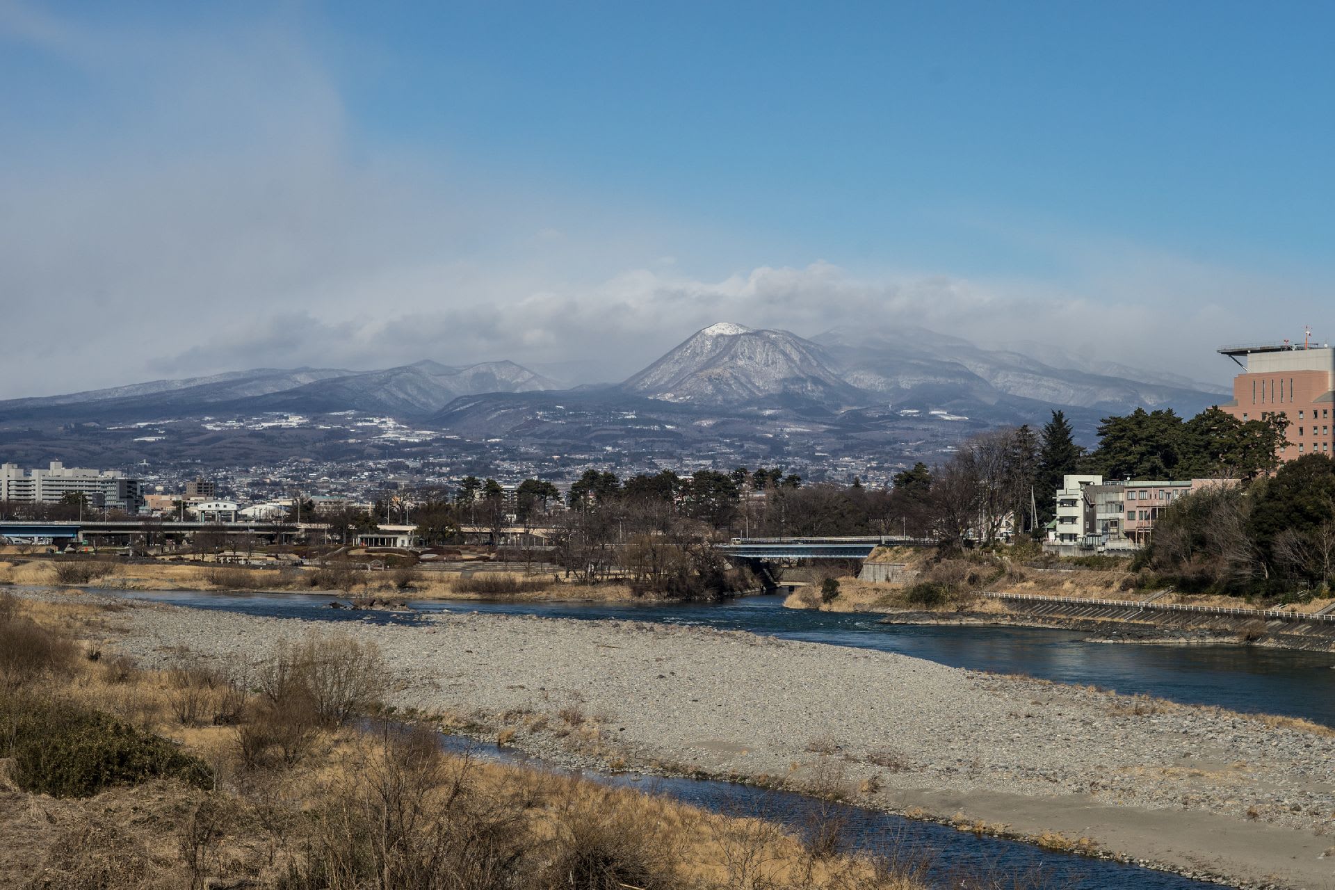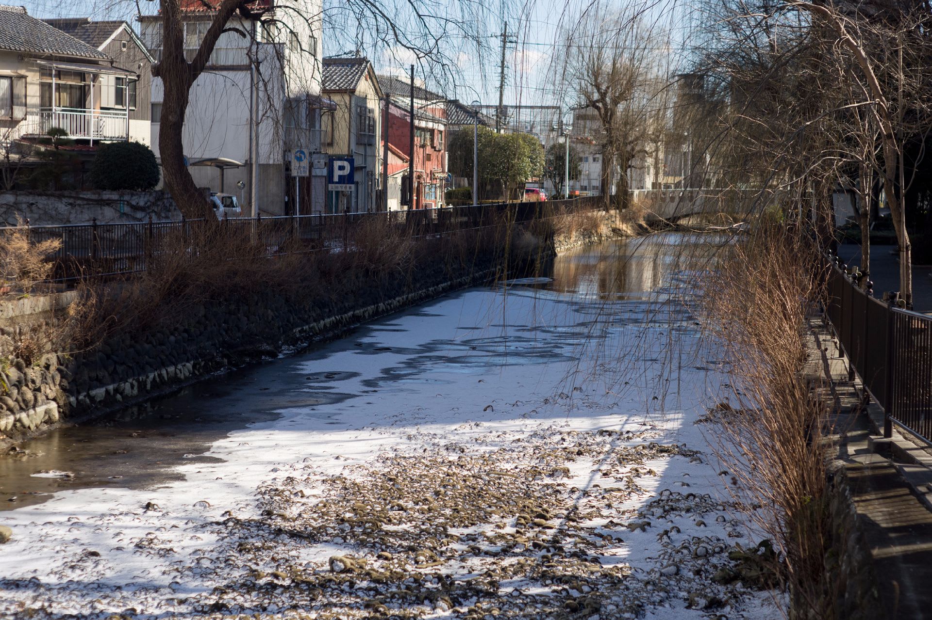 カメラを首からさげ散歩。風はないが気温は流石に低い。昨晩の少しの降雪がまだ残る。春の農作業の準備で広瀬川の水が止められ大掃除が始まった。