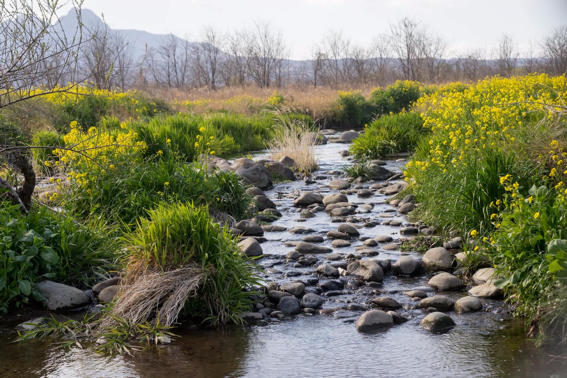 桃の木川は菜の花、諸葛菜、オオイヌノフグリ、ホトケノザ、ナズナ、といったところ。春の小川ではある。