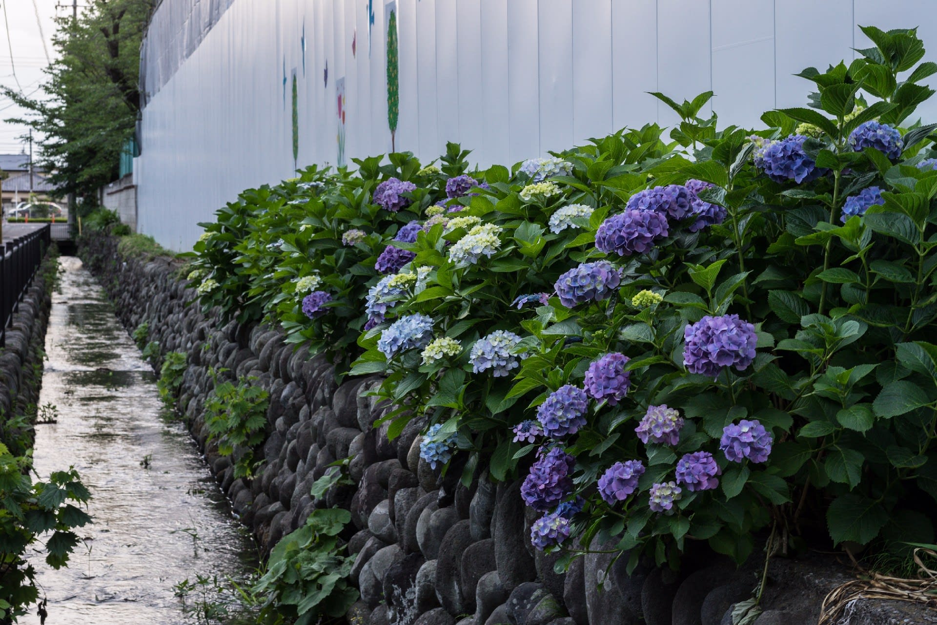 敷地東側を流れる谷田川という水路の石垣に張り付くように紫陽花が植えてあった。