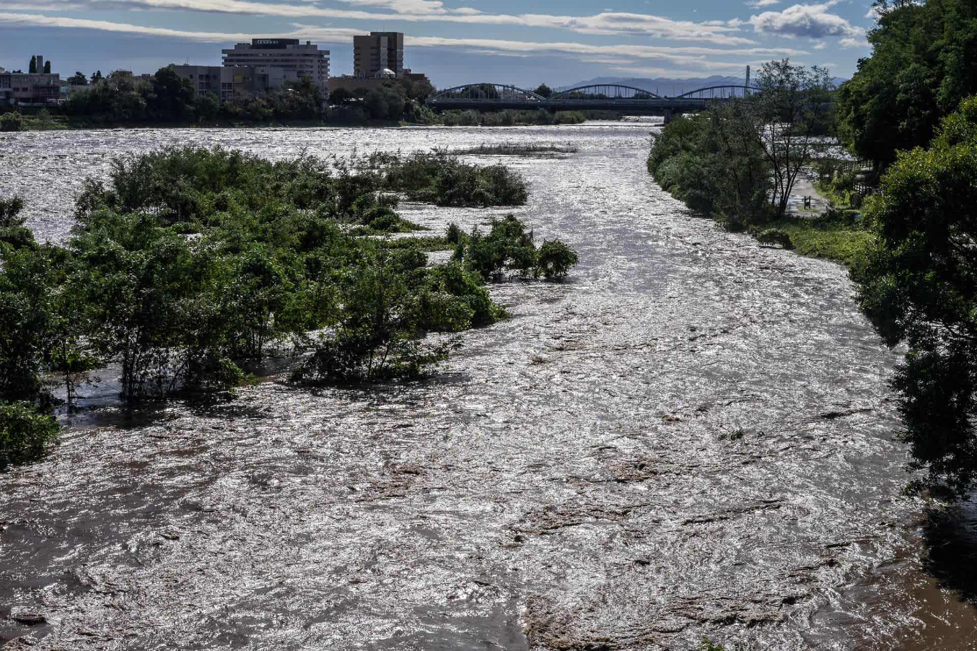 過去には前橋城の天守閣を川底に引き込んだ利根川。今日は久しぶりに川幅いっぱいの水量となる。
