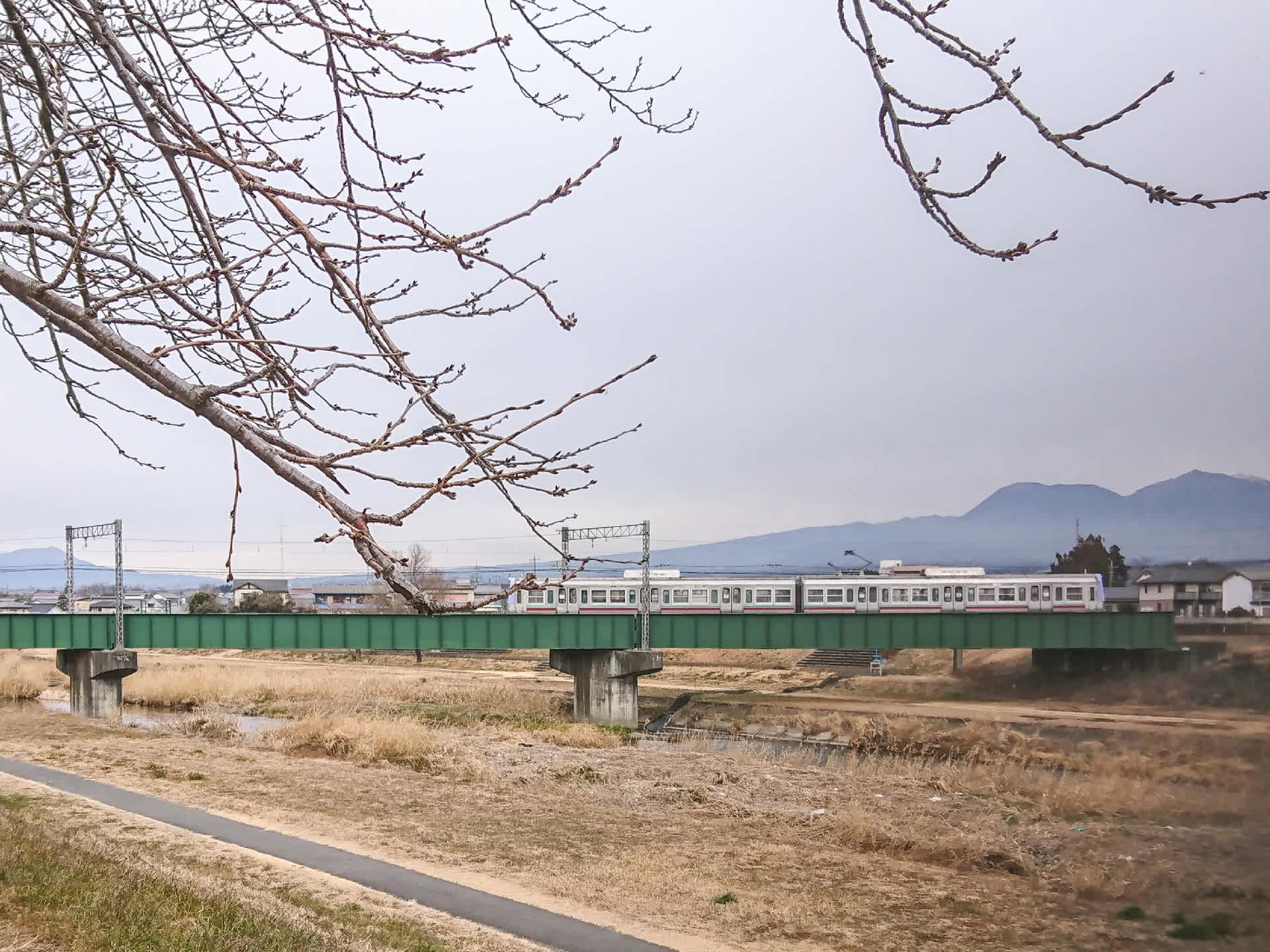 桃の木川の河原を寄り道。上電の西桐生行電車が通る。桜の季節には絶好の撮影ポイントだ。新発見。