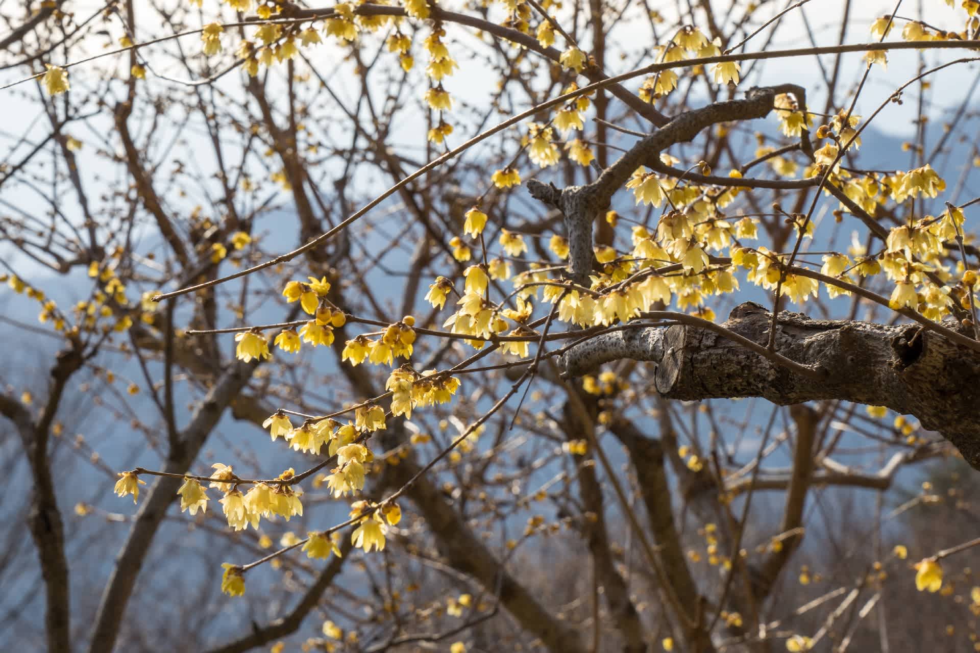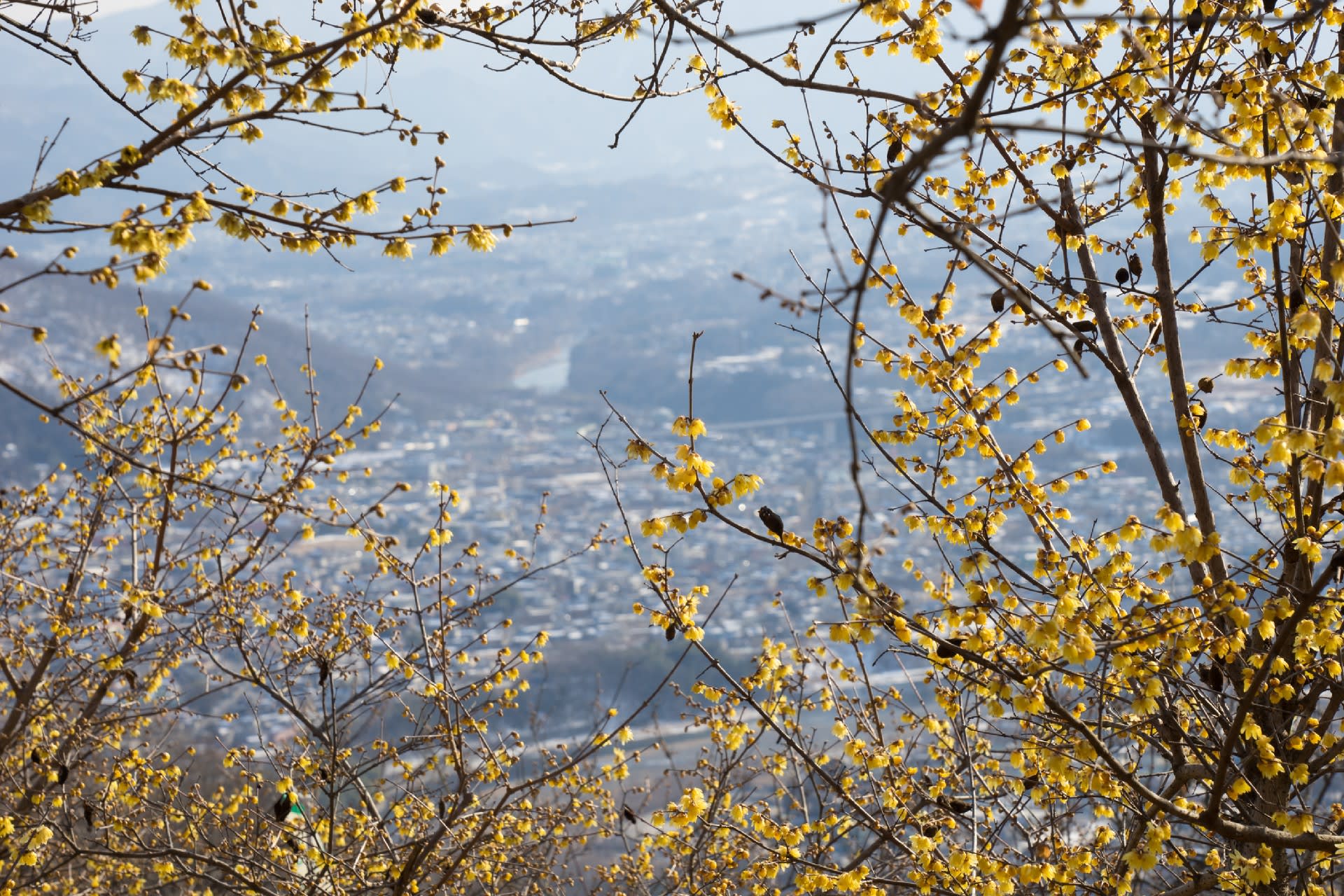 宝登山の蝋梅を撮りに向かう。まだ少し早かったようだが蕾も多いが花はきれい。空気が硬いが陽が出て気持ちは良い。