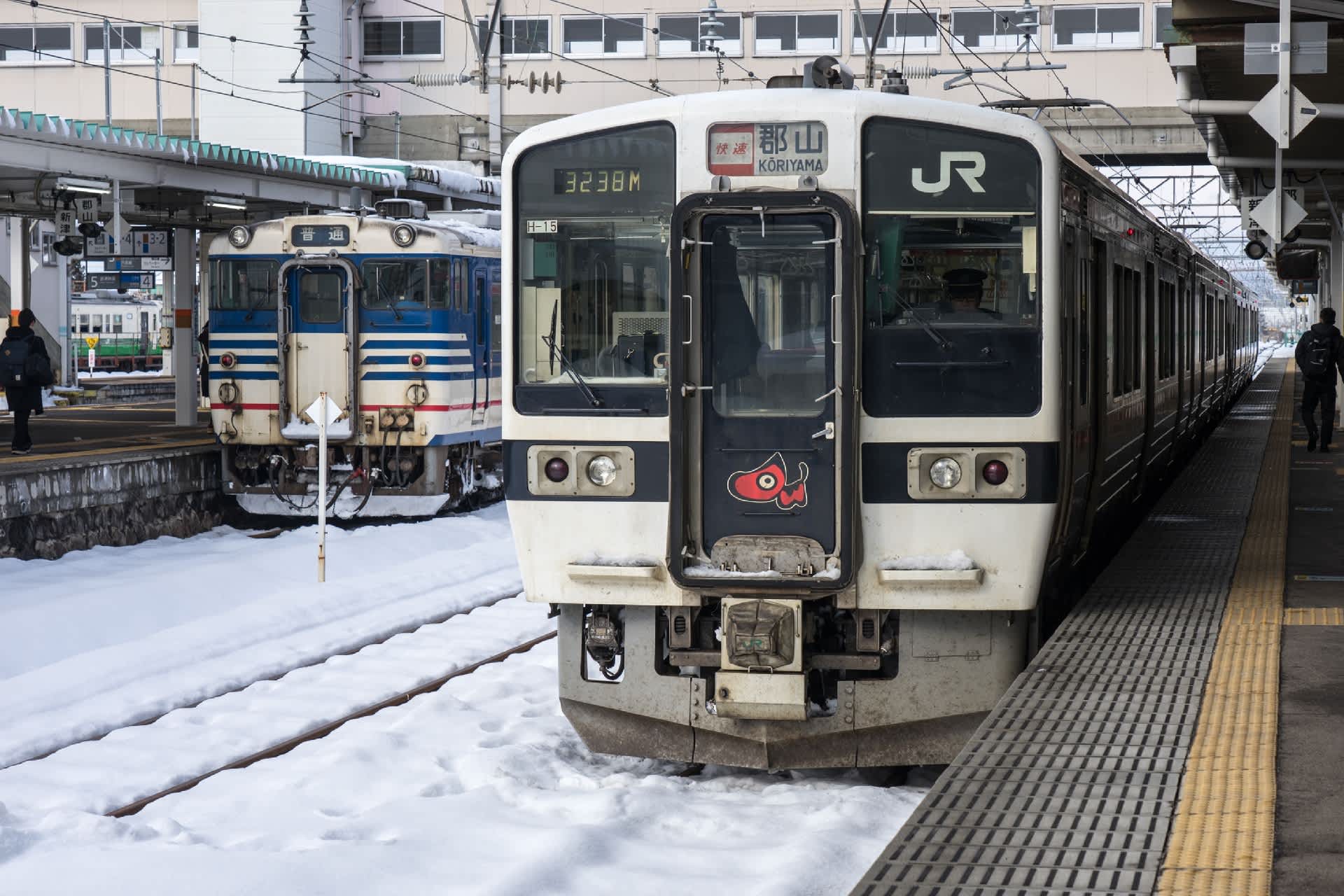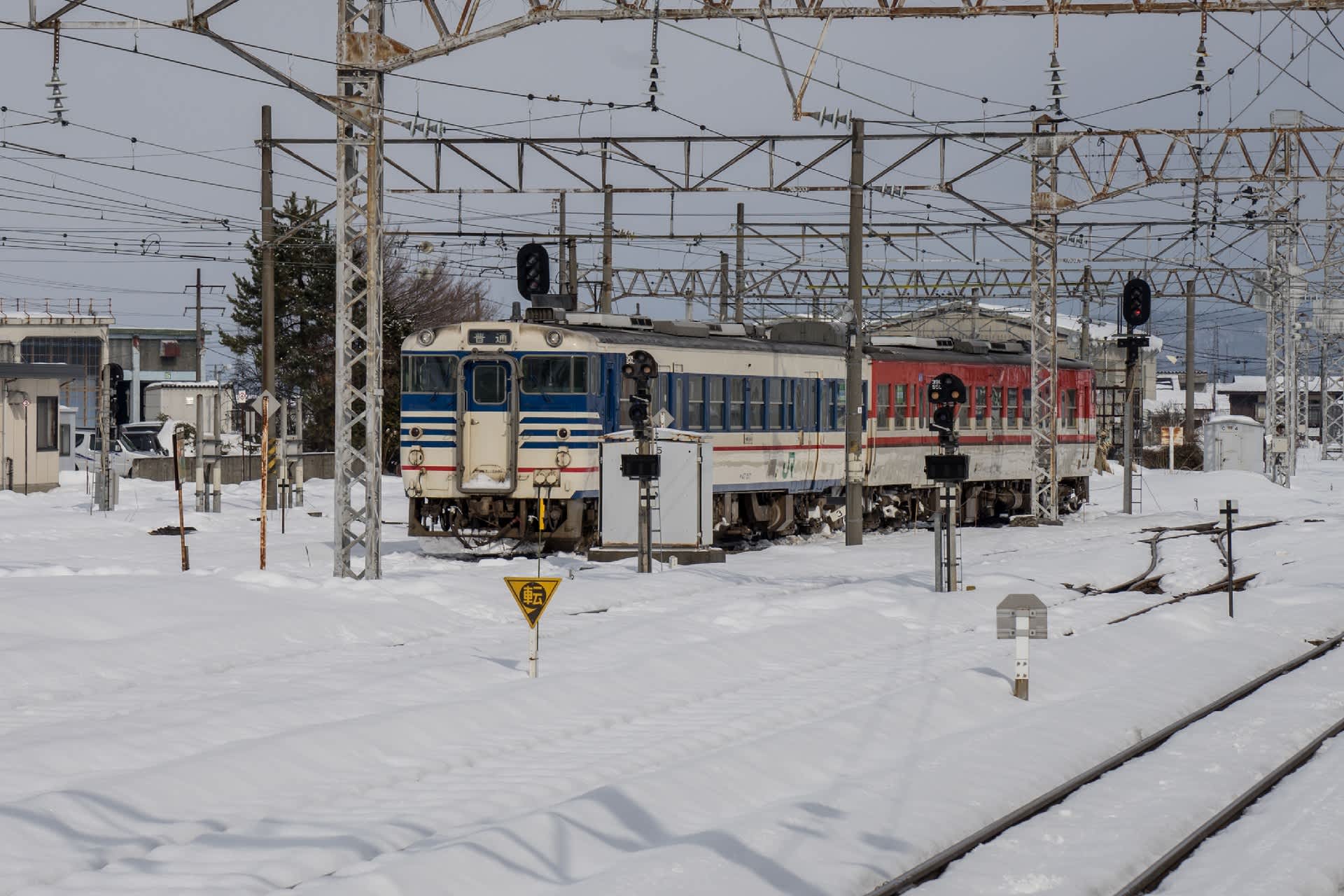 会津若松に着く。車体側面は賑やか。鉄道会社の様々な努力が伺われる。新潟色青・赤の混結。まだまだキハ40が頑張っている。