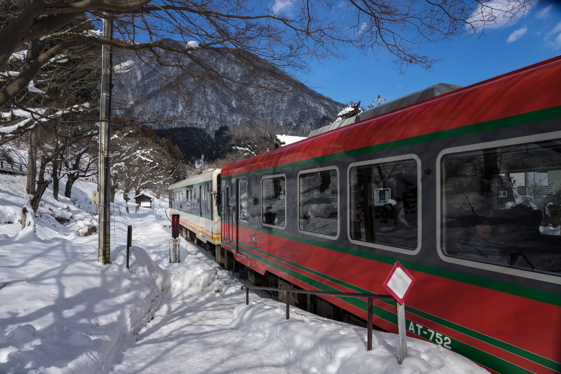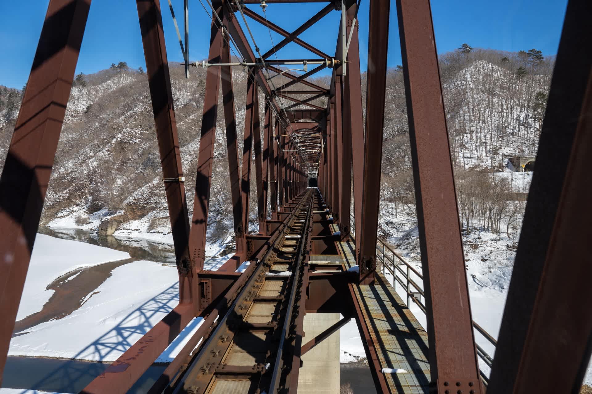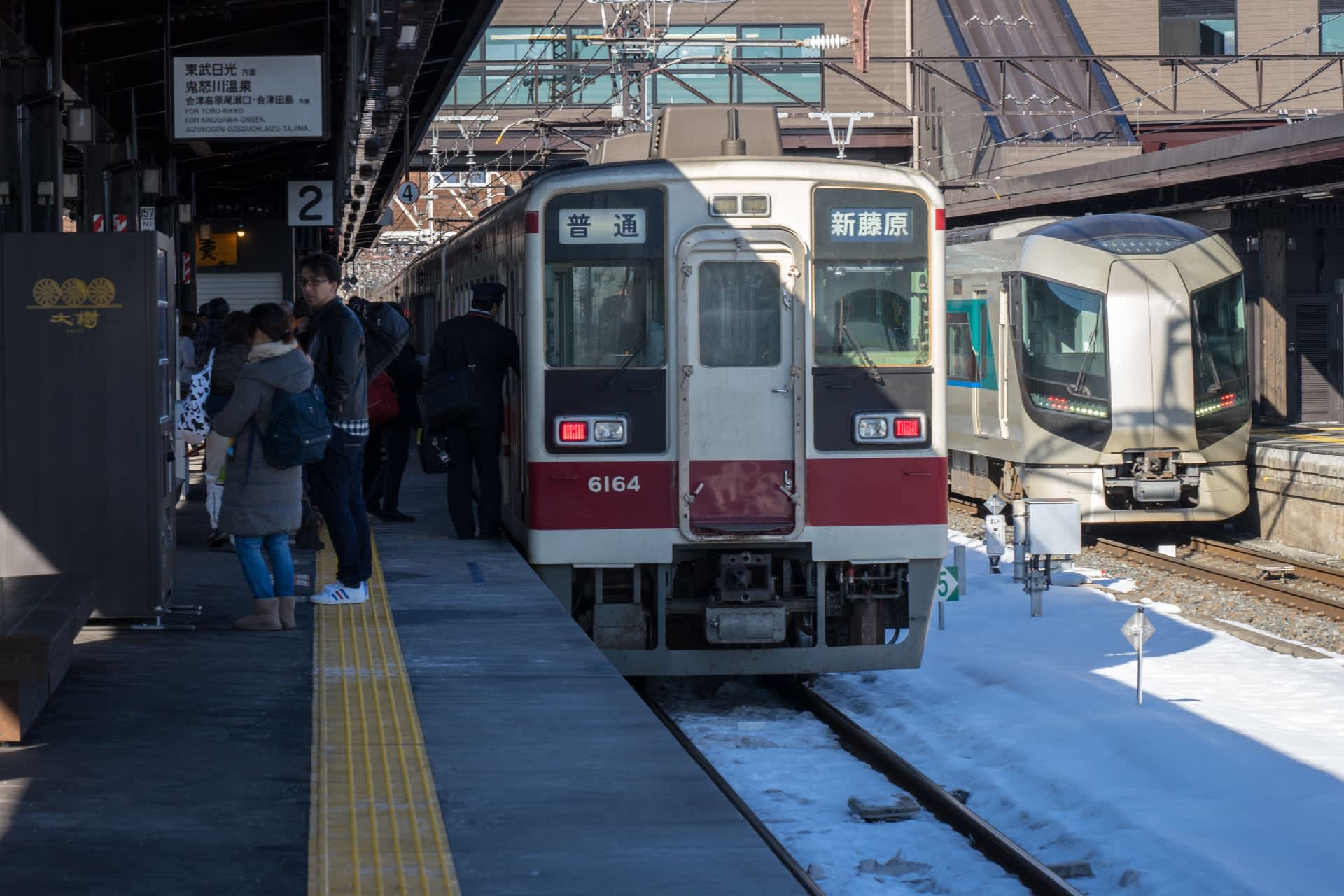 下今市で東武鬼怒川線に乗り換える。新藤原行きは6050型。 野岩鉄道、会津鉄道相互乗り入れ用の車輌。ボックス席というのは電車というより列車らしい。男体山など雪化粧の日光の山々がキラキラ光っていた。