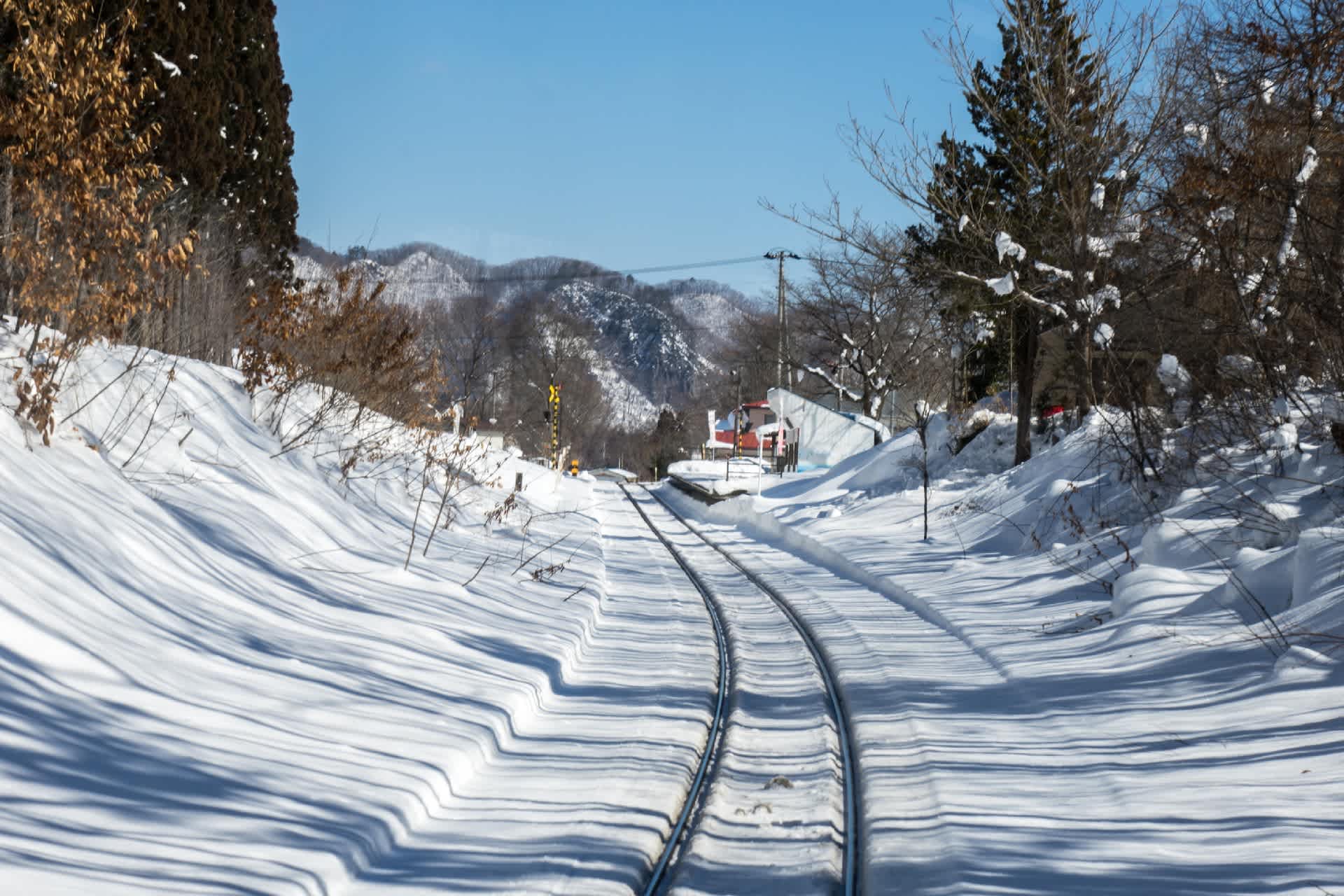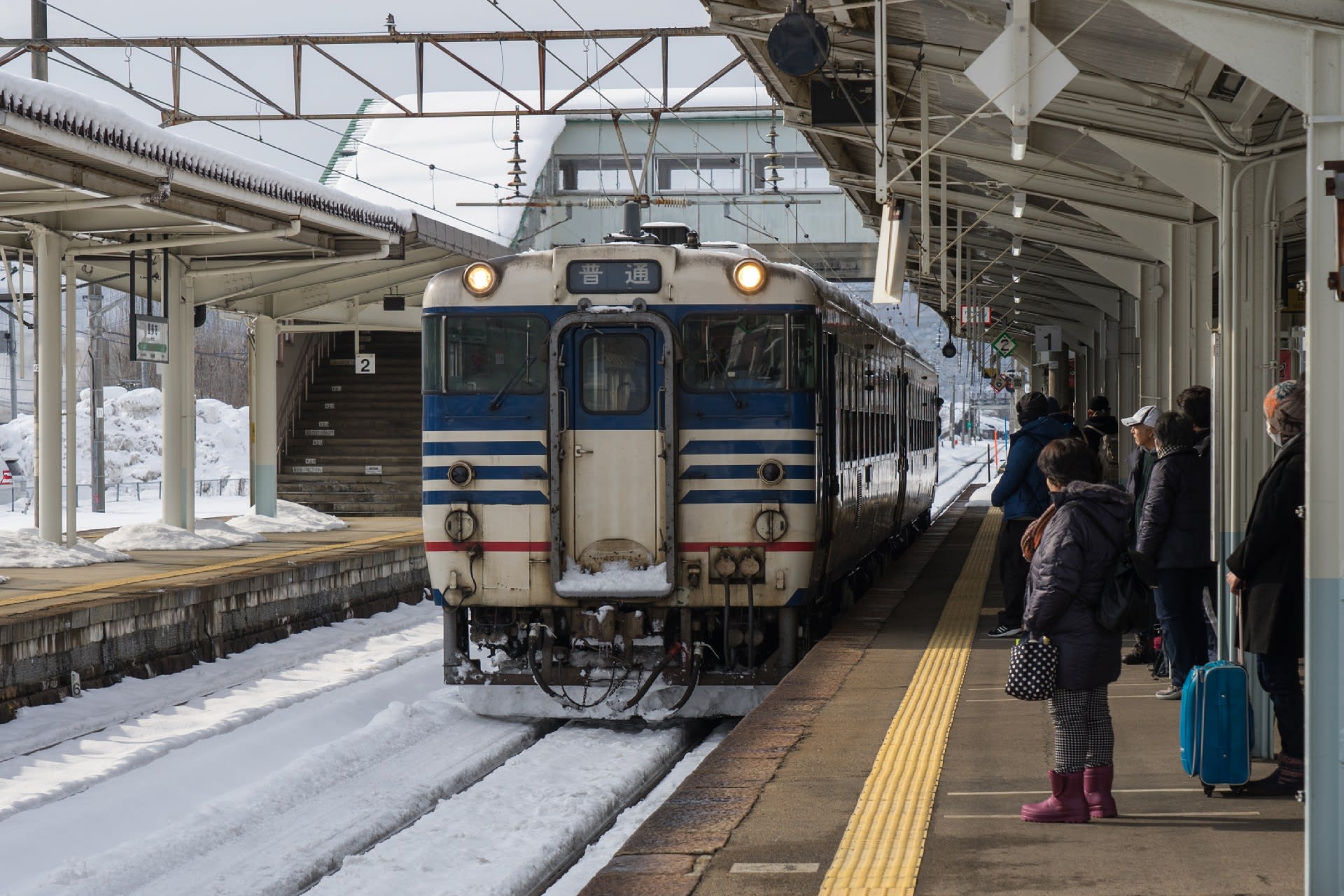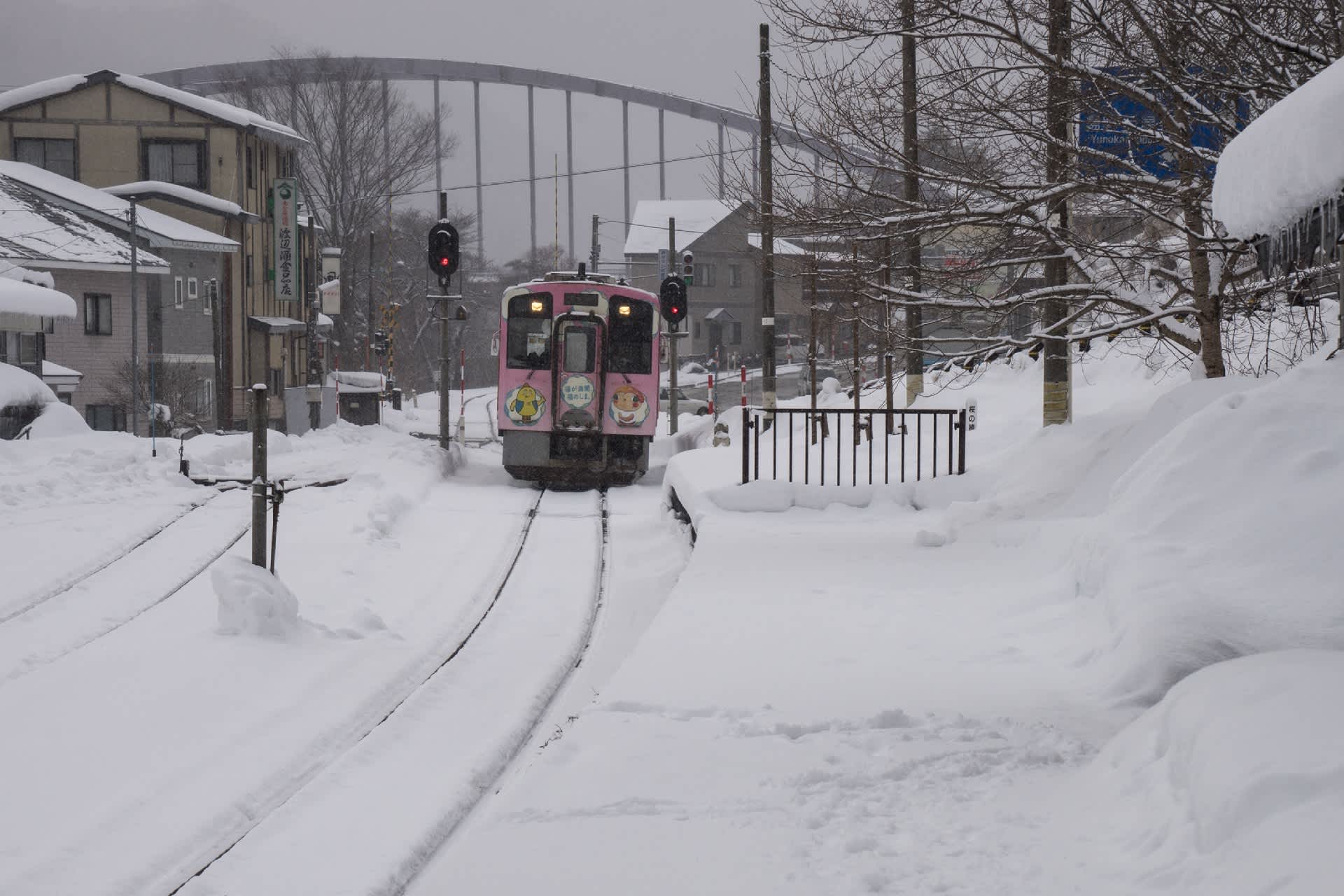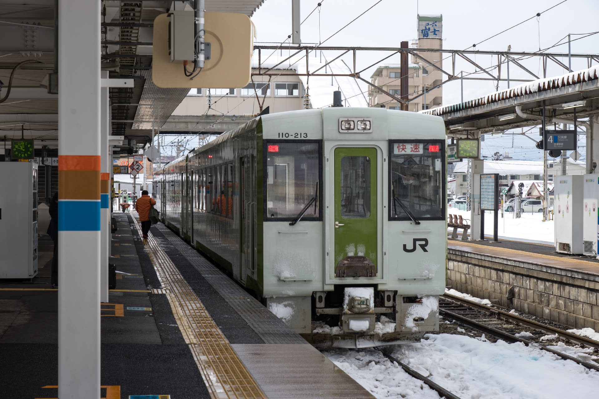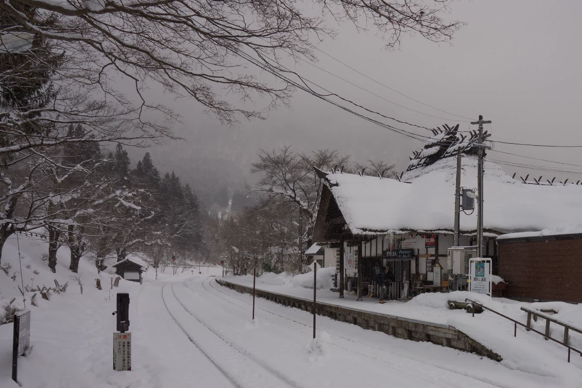翌朝は雪。あたりが霞む。風も少しありただ冷たい。これが雪国なのだろう。湯野上温泉発 会津若松行 たった一両の普通列車。