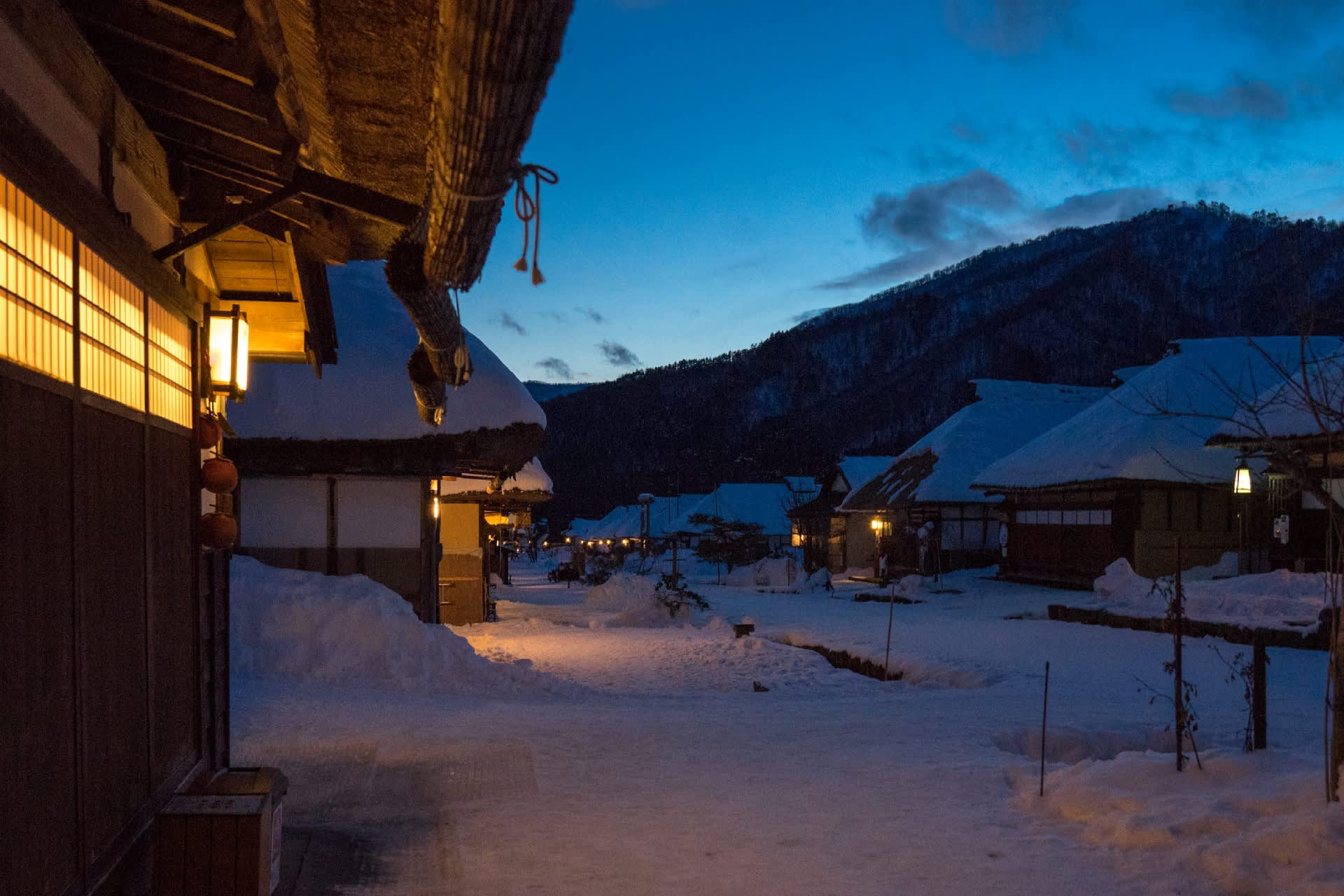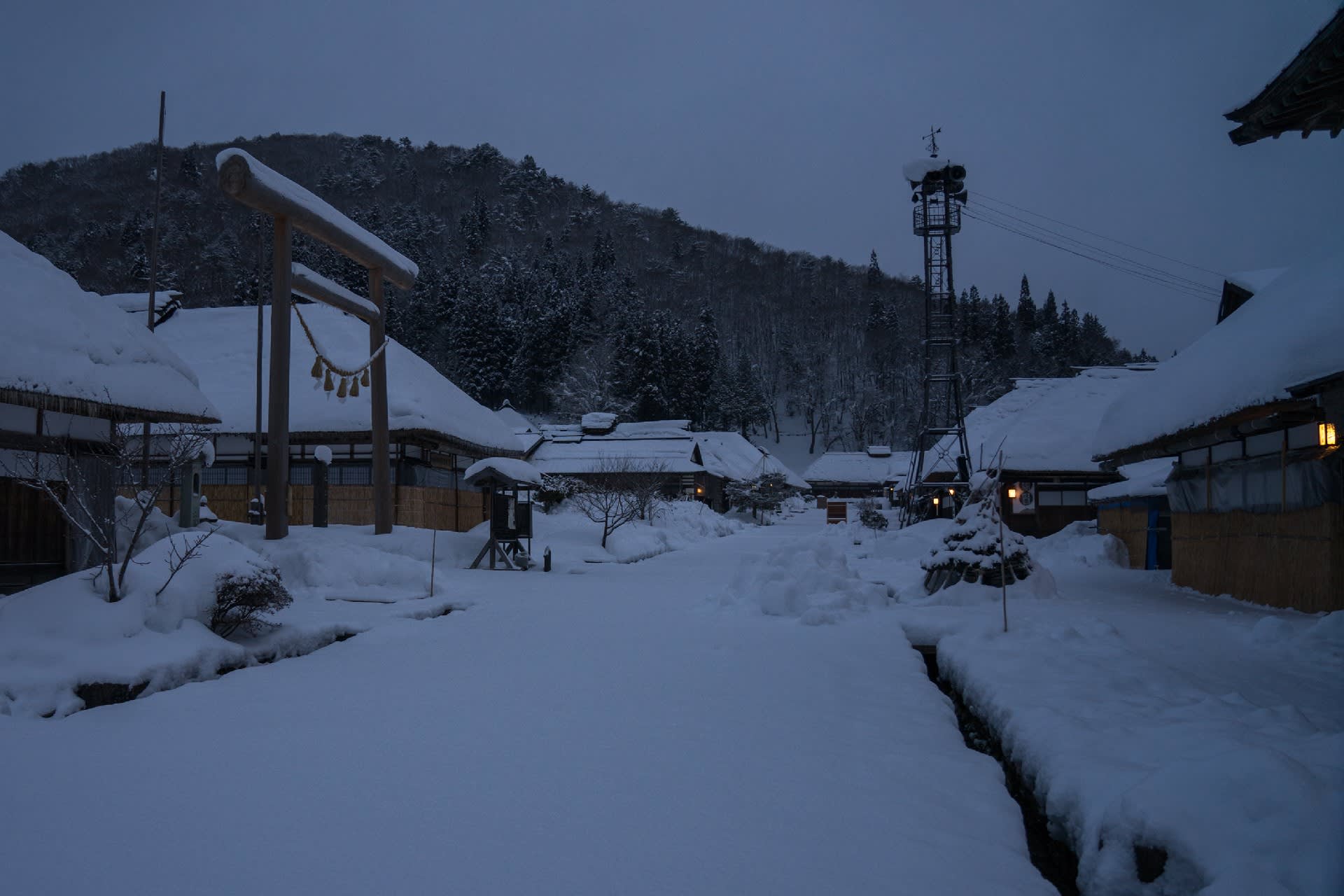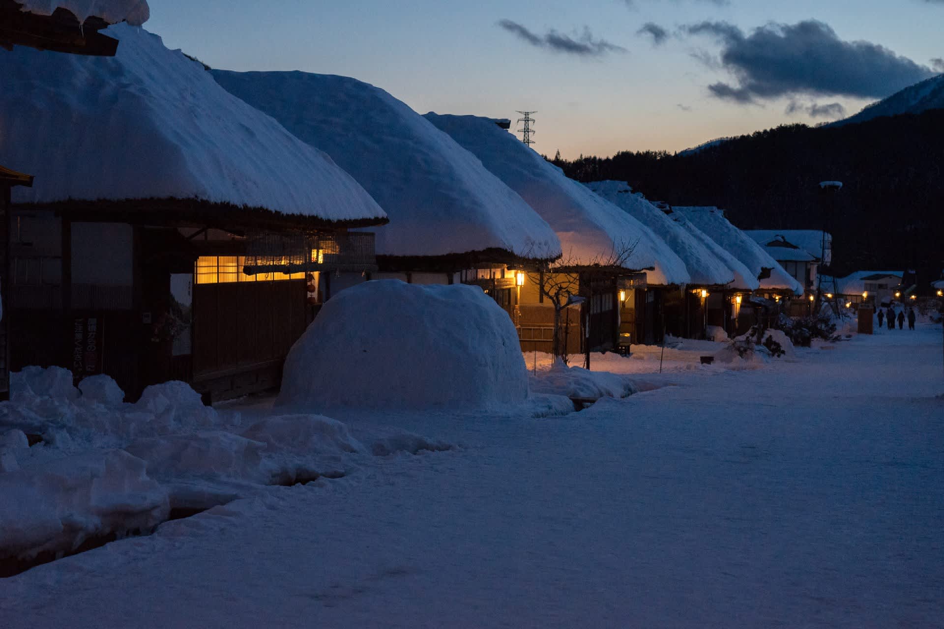 大内宿はかつては宿場町だったが現在は主要交通路から外れた一農村に過ぎない。昼間は観光客がたくさん見えるが午後4時ともなれば客足は途絶え店じまいが始まり6時といえばもう夜の気配。飲食店もない。夜は雪だった。雑音が吸い込まれれていってただ静か。