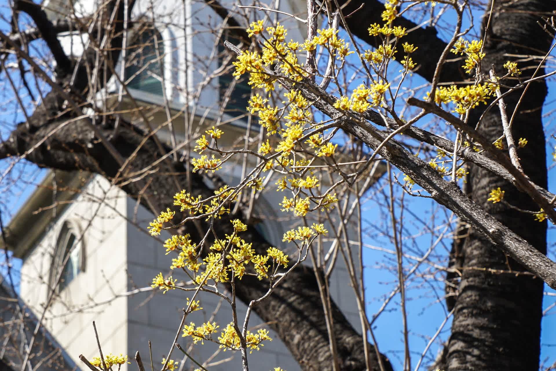 少しずつ街中も花の種類が増えてきた。近くの協会の庭の山茱萸も鮮やかな黄色い花を付けている。昼休みにちょっと撮らせていただく。開花の情報もあちこちで聞くようになった。