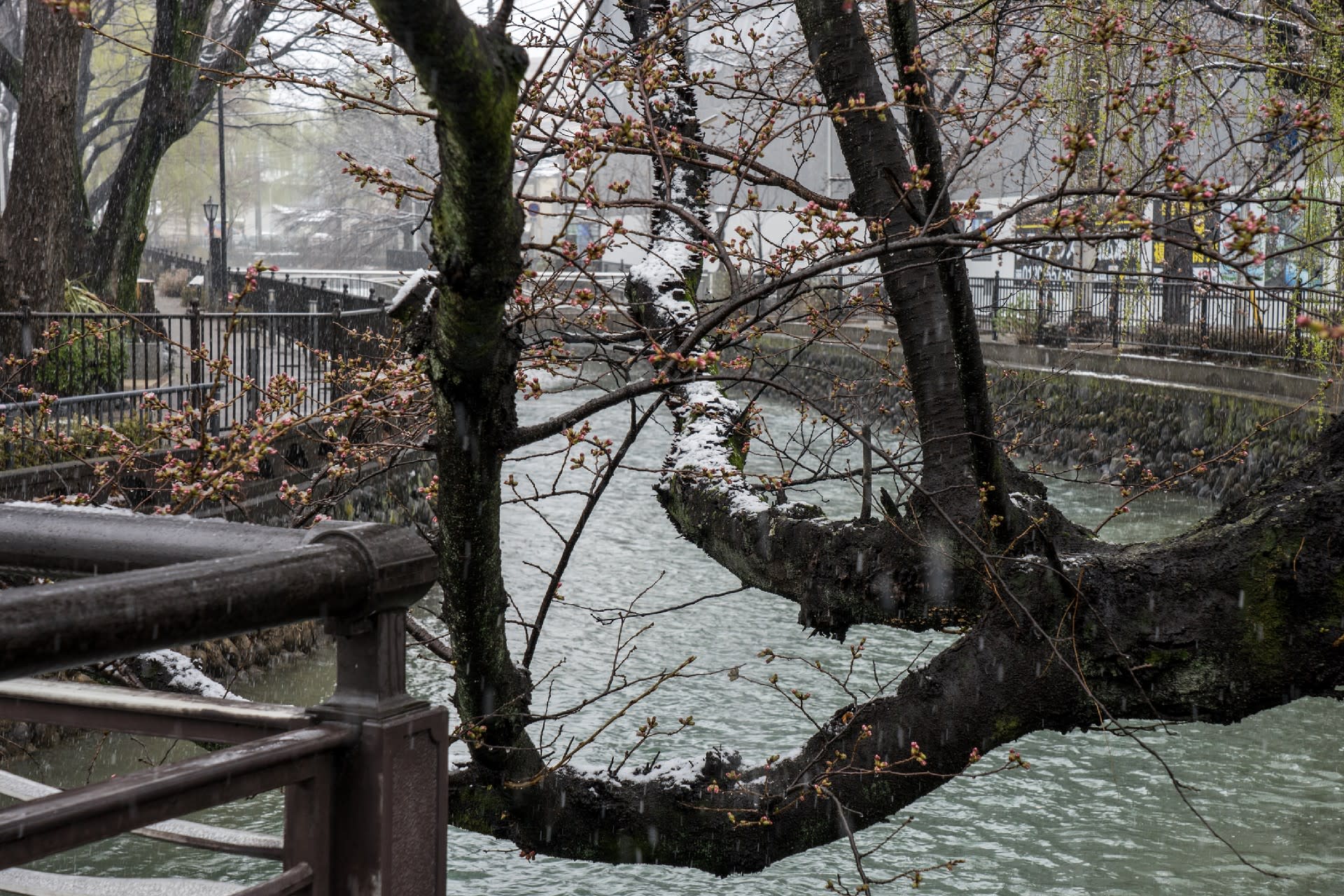 正午前から降雪有り。冬に逆戻り。それでも気温が高くぼたん雪。夕方には止み、路面には残らない。雪景色を撮ろうと街へ出る。やはりアスファルトの上には残っていないが植込はしろう帽子をかぶっている。前橋文学館前の桜の枝では蕾が大きく膨らんでいるのに雪が乗りちょっと可愛そうな印象。