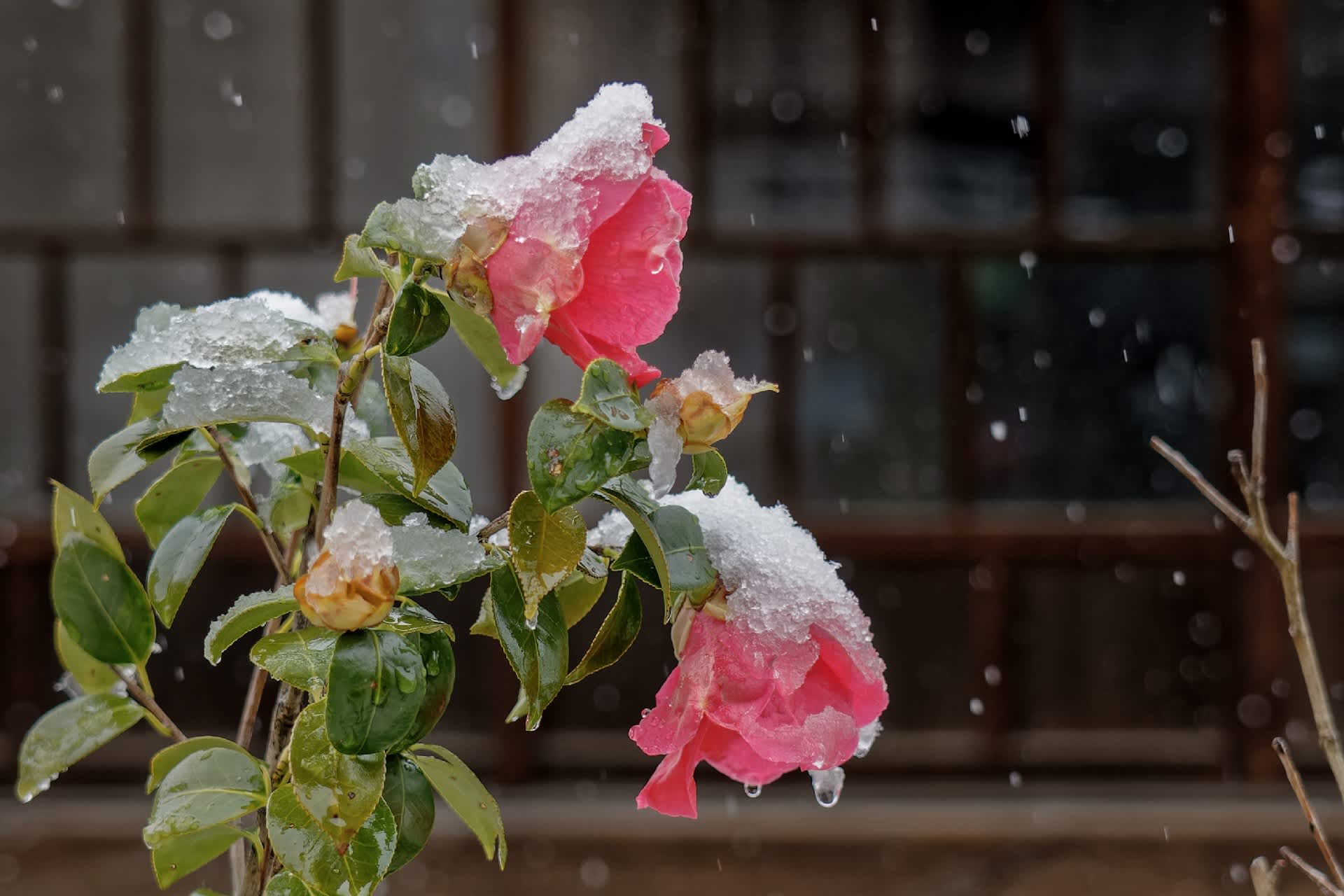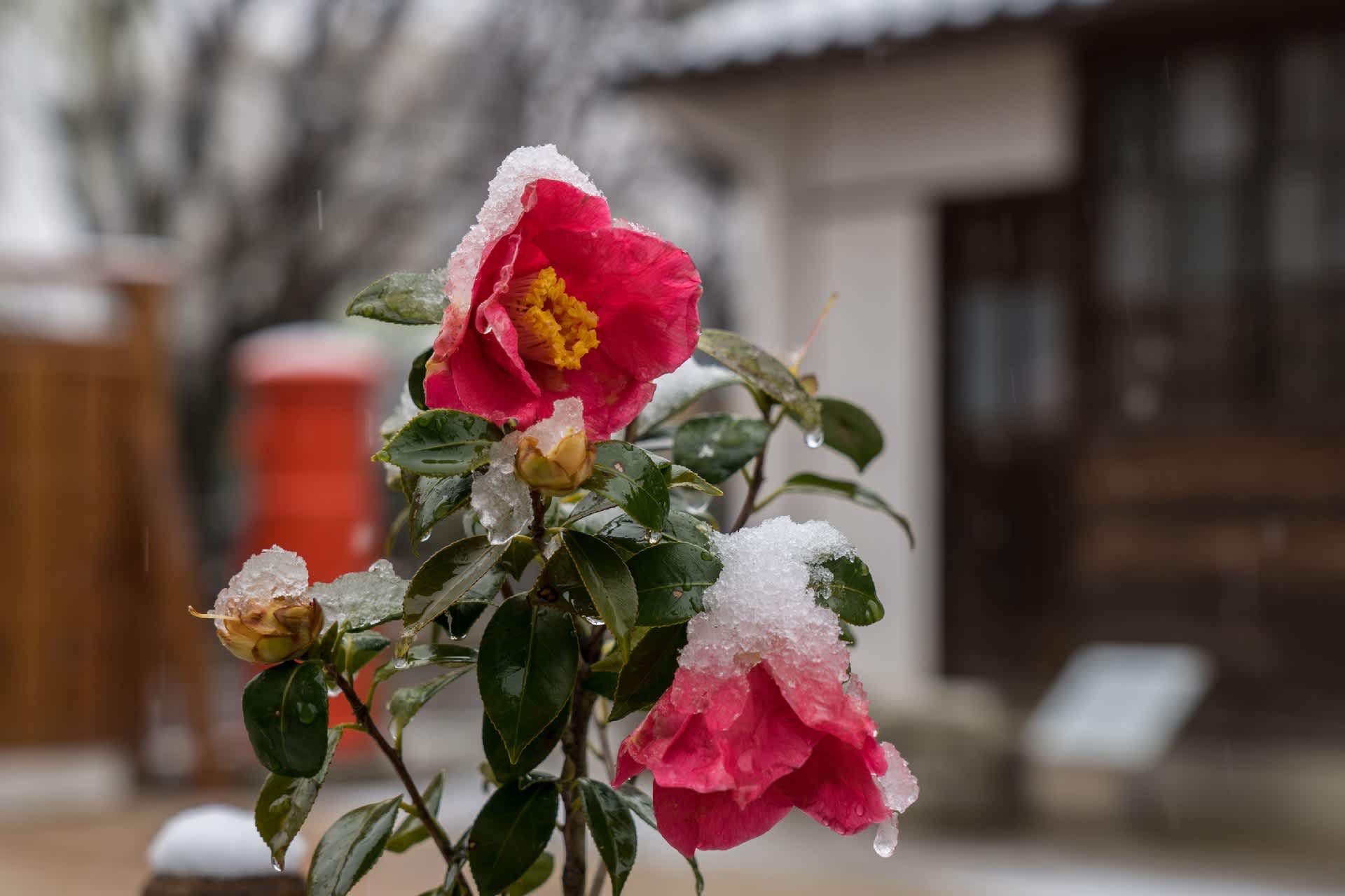 萩原朔太郎旧居の椿に生け垣にも雪が積もる。紅色の花弁と雪の対比が美しい。