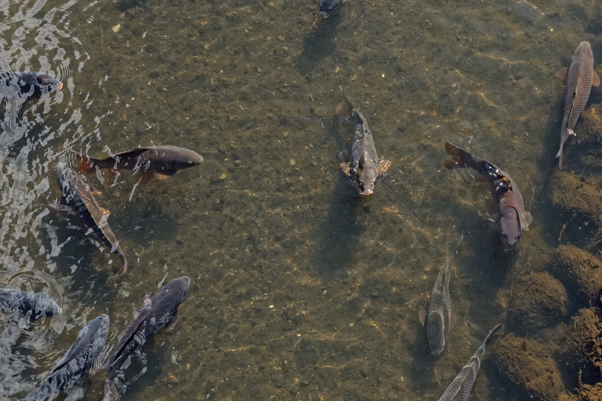 鯉は人影を見てよってくるが、お目当ての餌がないとわかると愛想もない。