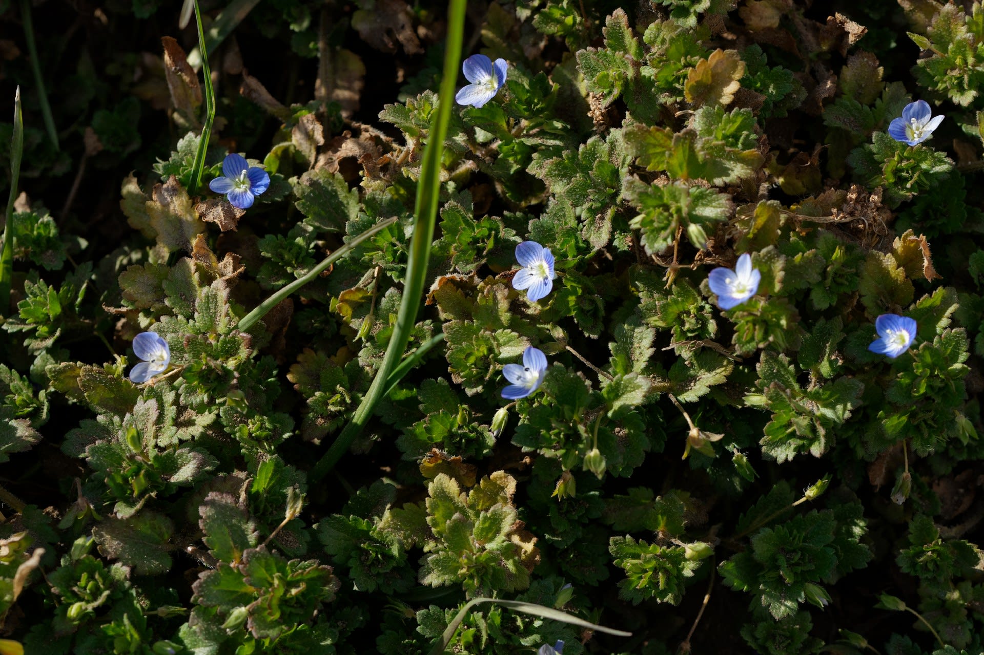 もう枯れ草の中にも緑が増えてきたような気がする。オオイヌノフグリの接写を試みるが風が強く、合焦が難しい。再度挑戦か。