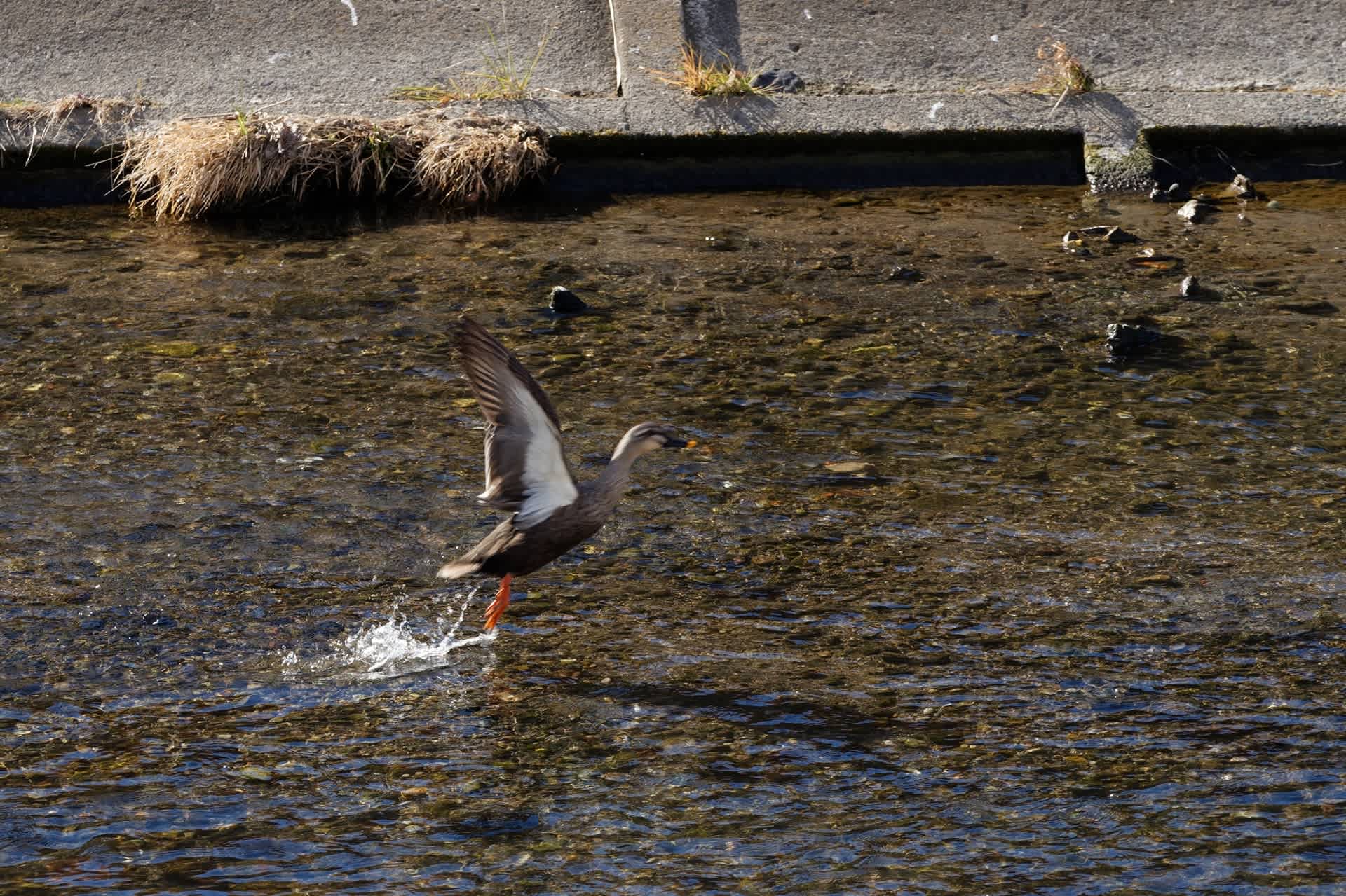 水鳥が堰で遊んでいる。風が強いのも気にかからない様子。