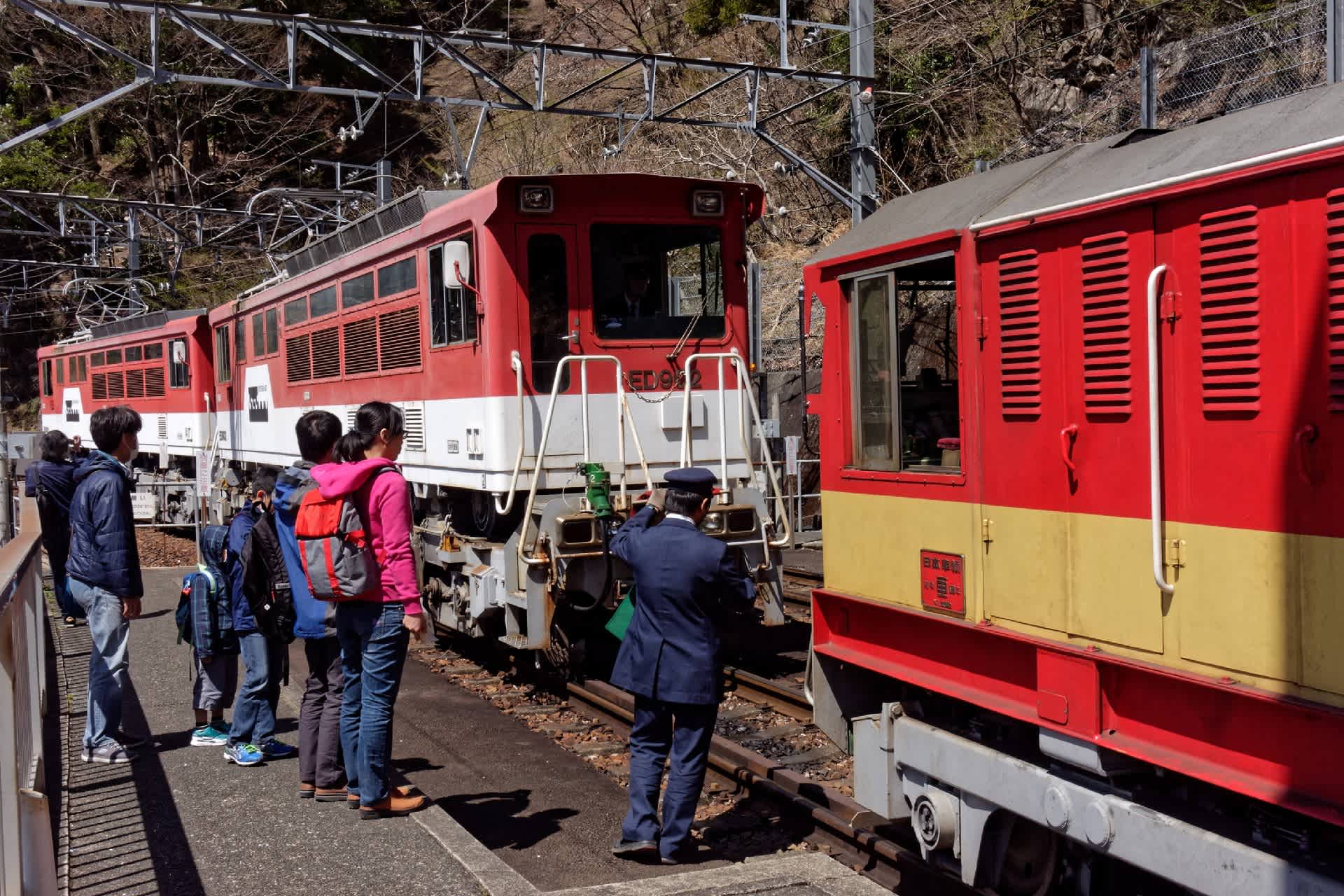 1時間半近くかかって終点及川に到着。途中の見せ場は一区間だけだがアプト式機関車を増結しても山登り。4分ほど停車して連結作業を乗客は見守る。