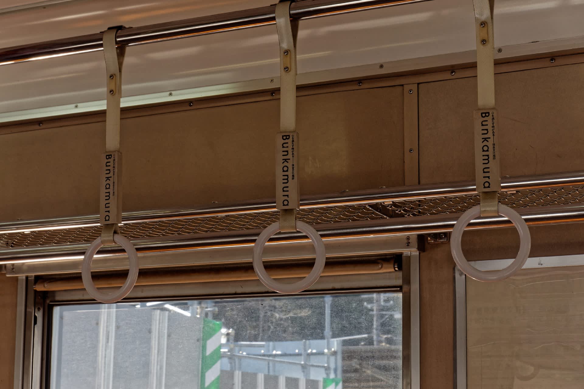 新金谷からは旧東急のステンレス車で金屋まで。吊り革が「BUNKAMURA」のネーム入りがご愛嬌。