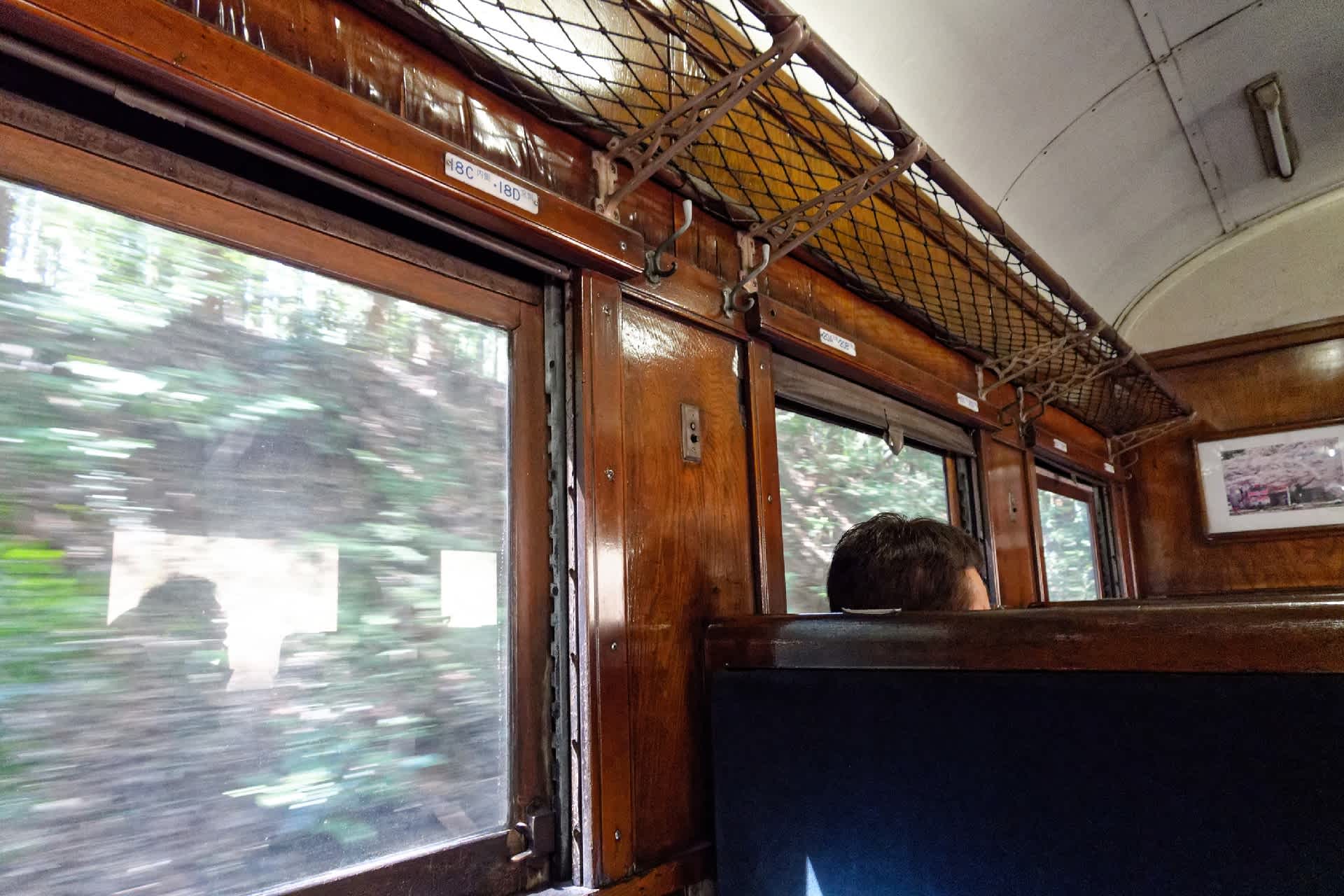 窓ガラスも正直なところ煤だらけ。車輌も営業運転するにはギリギリな状態だ。JRでは走らせることが出来ないだろう。ただ運転密度や古いことそのものに価値のある鉄道だから許されるのだ。