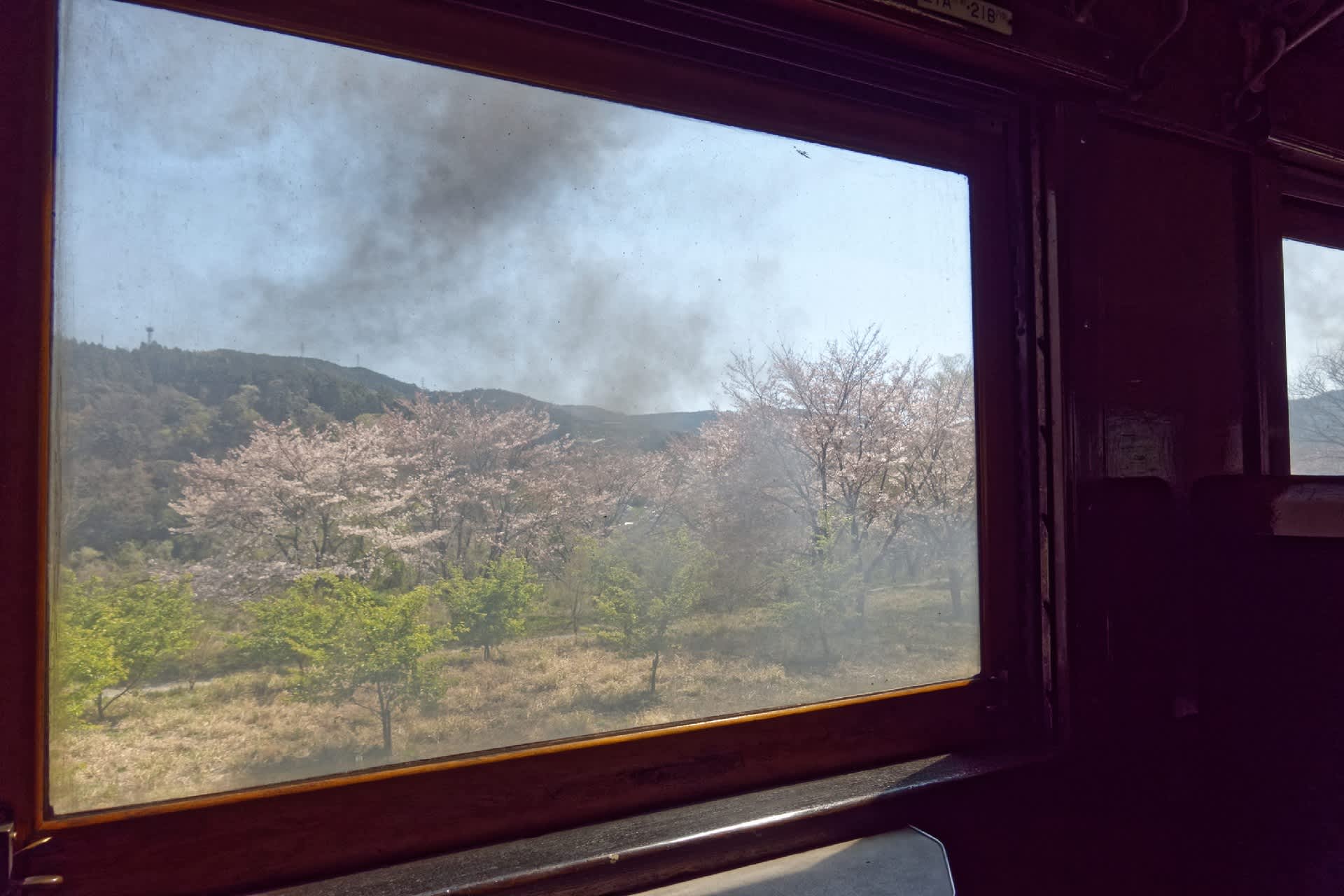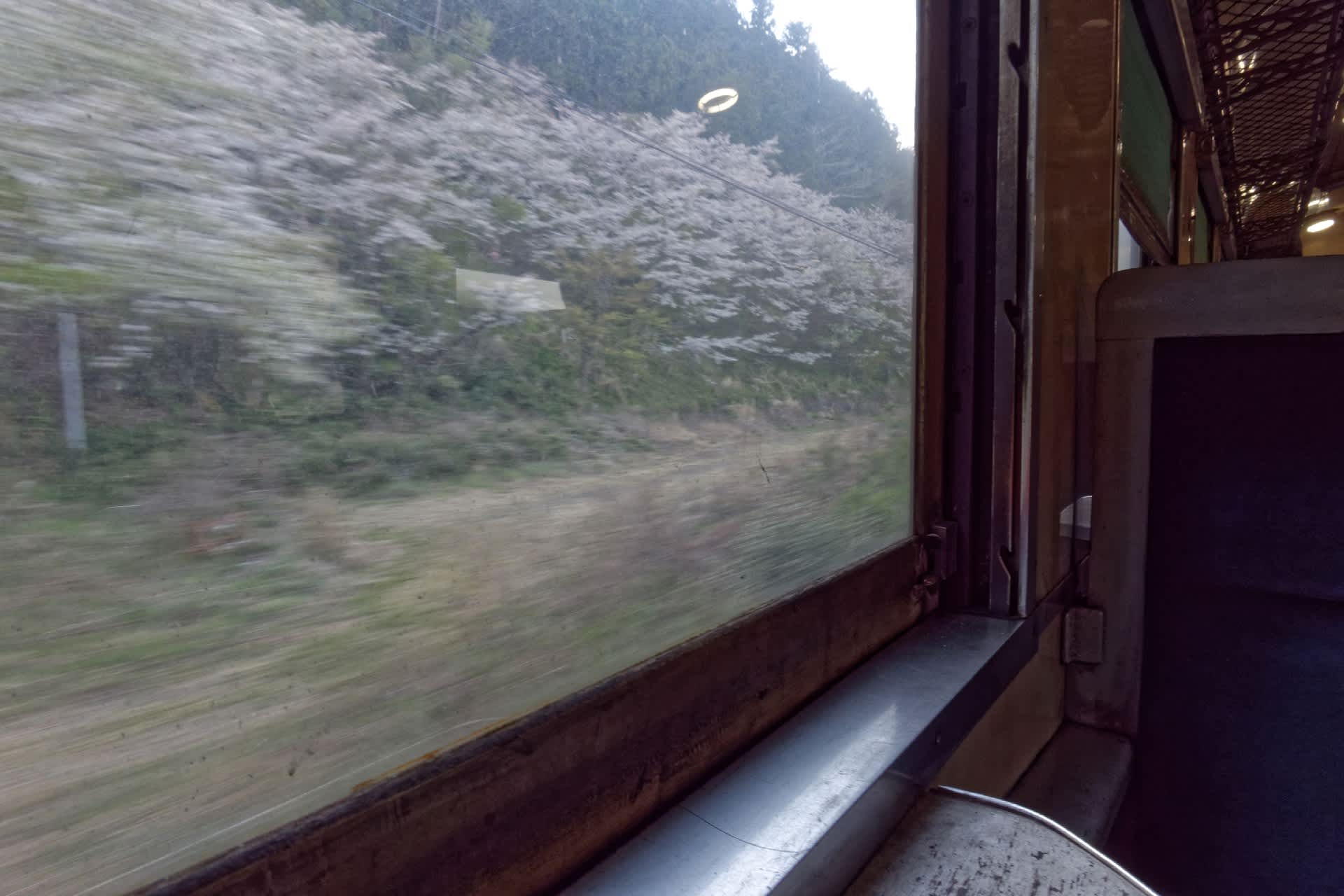 窓の外は桜が満開。カメラの砲列も場所取りが大変だったろうなという感じ。負け惜しみでもなく帰路も乗っていてよかった。