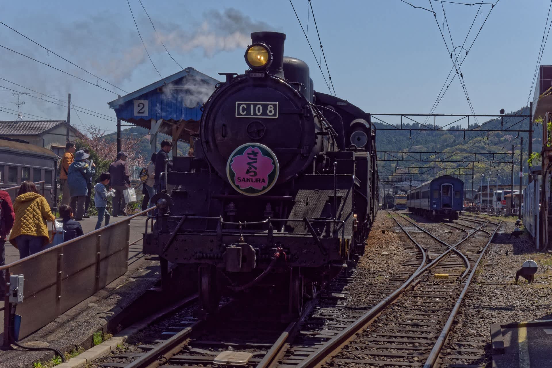 当日乗り込むSL急行の車両はすでにホームに入線している。牽引はC10 8で昭和5年製、すなわち父親と同じ年だ。高崎機関区にの在籍していたようだ。大井川鐵道のレールや橋脚は幹線用のものより華奢である。入線しているSLも小型機ばかりであるが維持管理はこちらのほうが楽であろう。