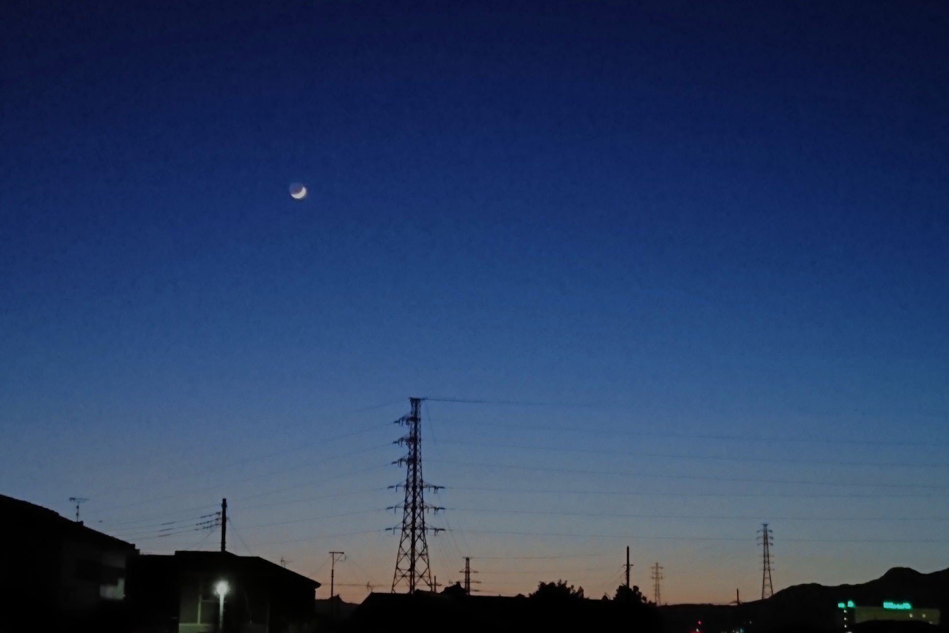 日中は北西の風が強く窓も開けられない。帰路強い向かい風を覚悟していたが19時過ぎには穏やかに。ふと西の空を見るとブルーアワーの空に三ヶ月が。穏やかな時間。
